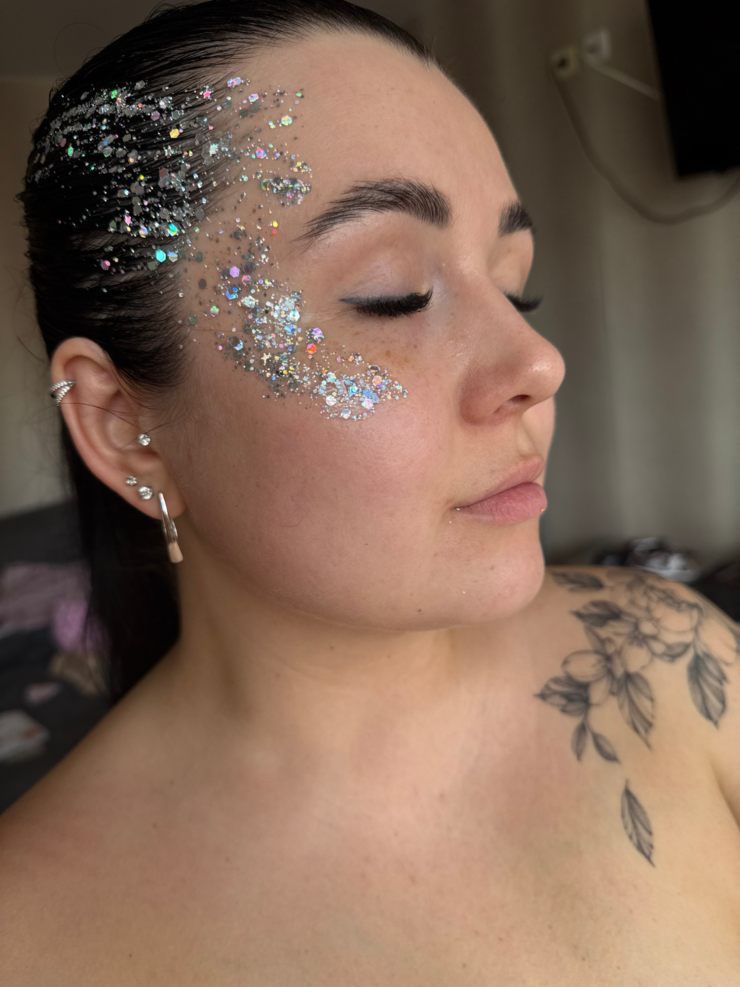 The image presents a close-up, high-angle portrait of a person, likely female, lying down with their eyes closed, suggesting a state of rest or relaxation. The subject's head is tilted slightly to the…read more