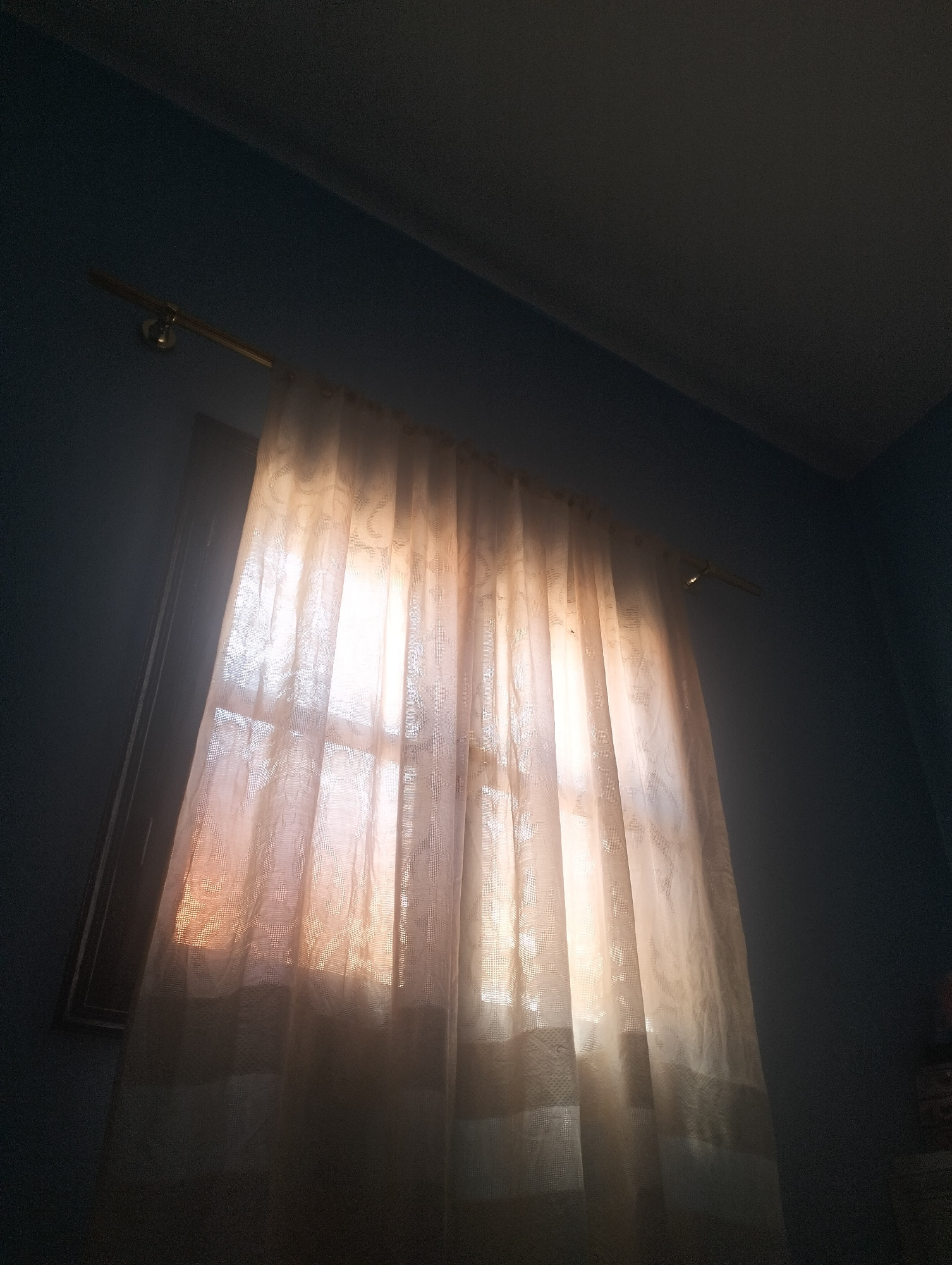 The image depicts an interior scene within a room located in Ouaouizert, Morocco. A large window, partially obscured, is covered by light-colored, sheer curtains featuring a subtle patterned weave. Na…read more