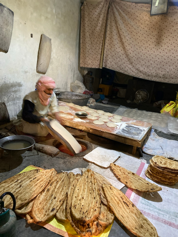 A person wearing a pink head covering is working in a room, placing dough onto the inside of a cylindrical oven. The oven sits next to a table covered in dough. To the right of the oven, freshly baked…read more