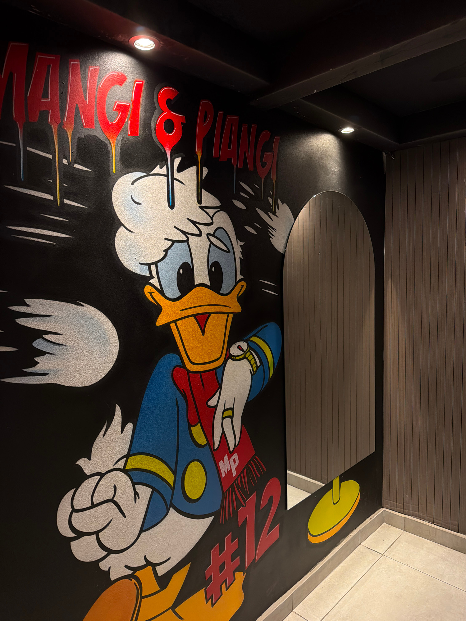 An angled photograph captures a wall mural of Donald Duck on a black background. Donald is wearing a blue jacket with yellow buttons and a blue hat with yellow stripes. He is holding a playing card in…read more