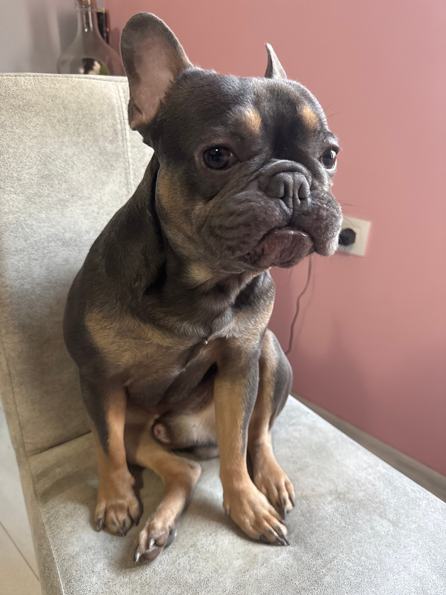 A French bulldog is lying on a light gray couch. The dog is mostly gray with tan markings on its legs and face. It has a wrinkled face and large, upright ears. The dog is looking up and slightly to th…read more