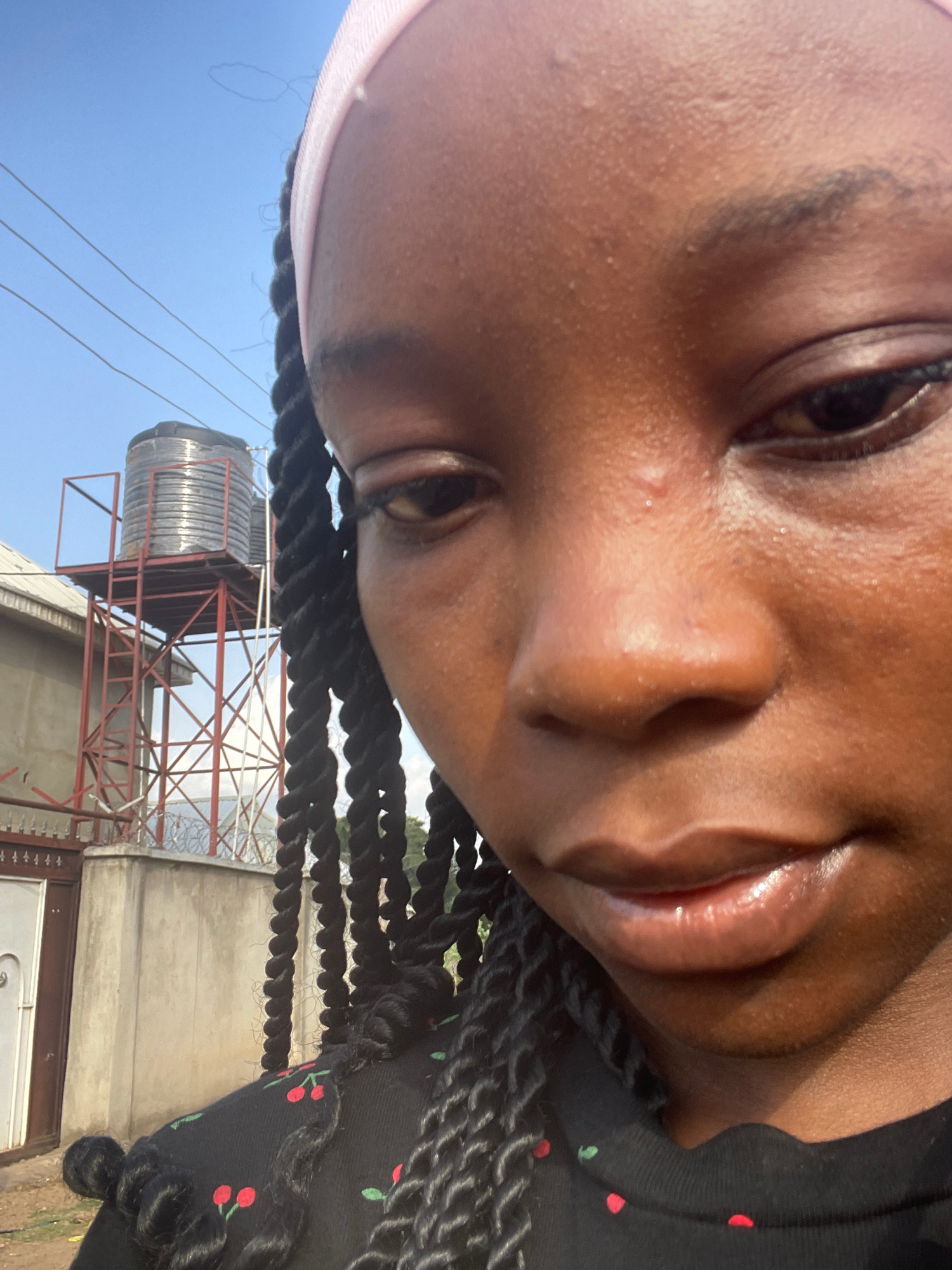 The image is a close-up, brightly lit portrait of a person with dark skin, positioned at a diagonal angle, appearing as if the camera was held sideways. The person's face dominates the upper left port…read more