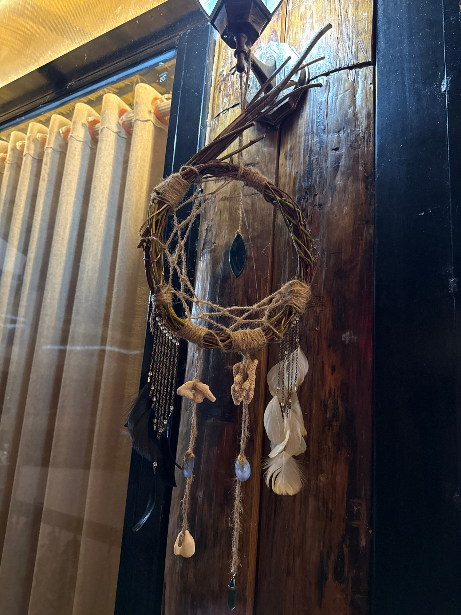 A dreamcatcher made of twigs and twine hangs against a brown wooden surface. It features white and black feathers, beads, a shell, and a piece of coral. The dreamcatcher is in front of a window with c…read more