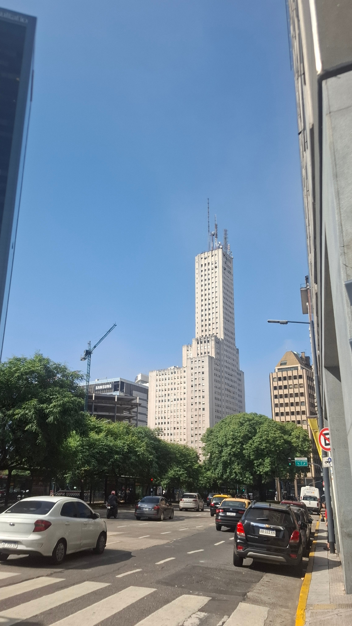 Here is a description of the image: The image captures a street scene in Buenos Aires, Argentina, featuring a tall, light-colored skyscraper in the background and typical urban elements. The buildingβ¦read more
