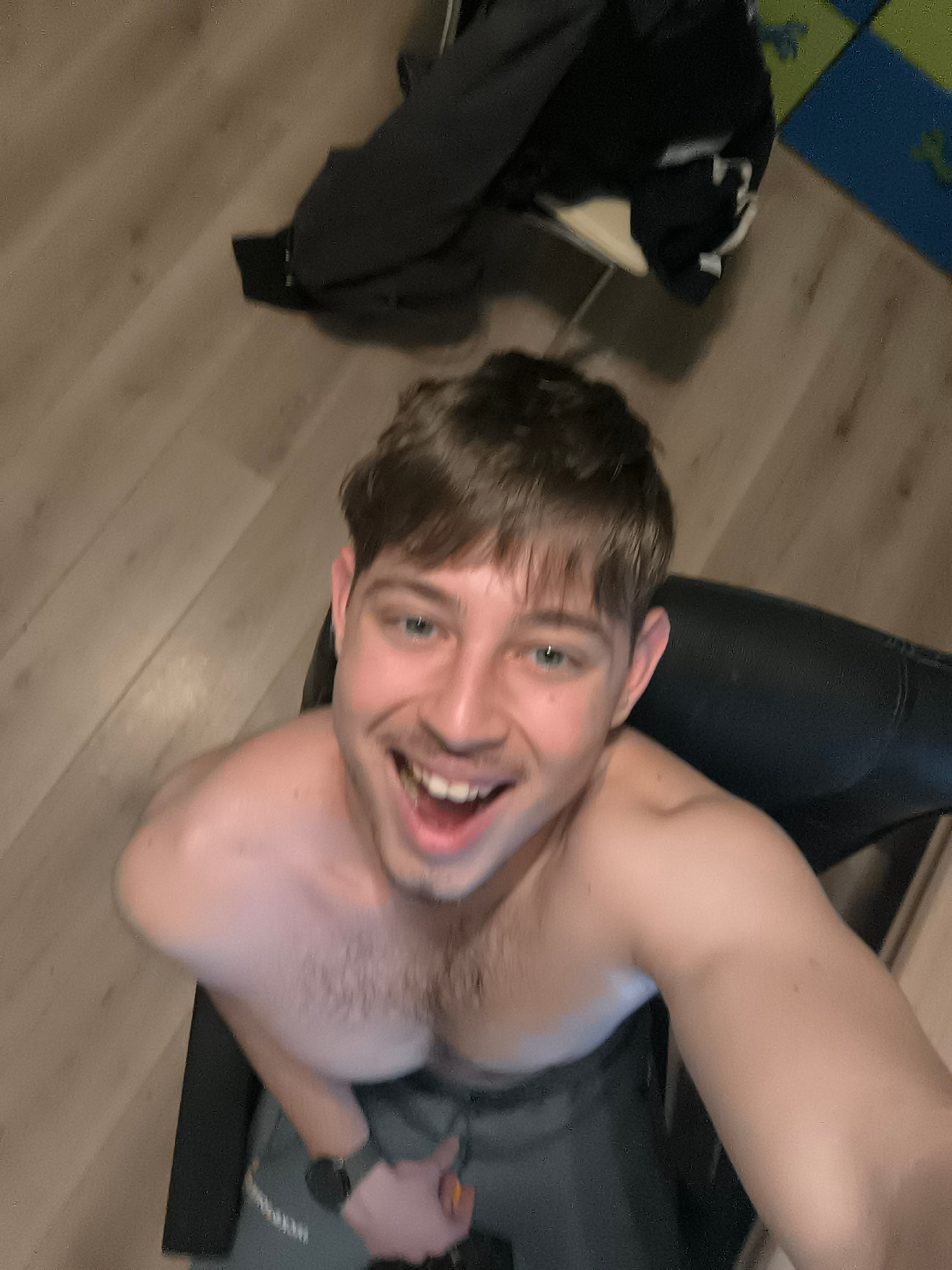 A medium, high-angle shot shows a young, shirtless man sitting in a black chair. He is smiling with his mouth open and looking up at the camera. He is wearing gray pants and a black watch on his left…read more