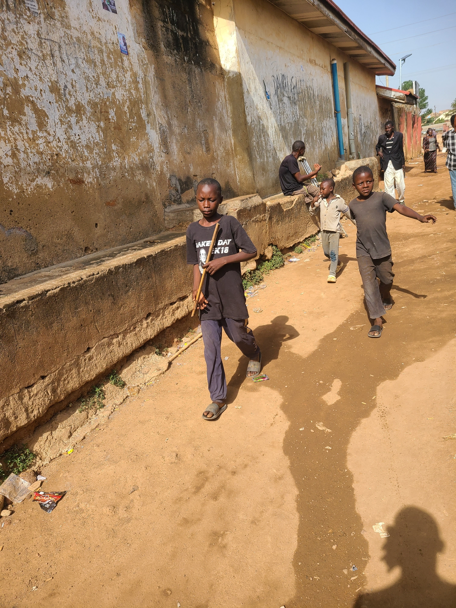 An outdoor scene in Jos, Nigeria, depicts several young males on an unpaved, sandy-brown path next to a concrete wall and drainage ditch under bright daylight. In the foreground, a young boy in a blaβ¦read more