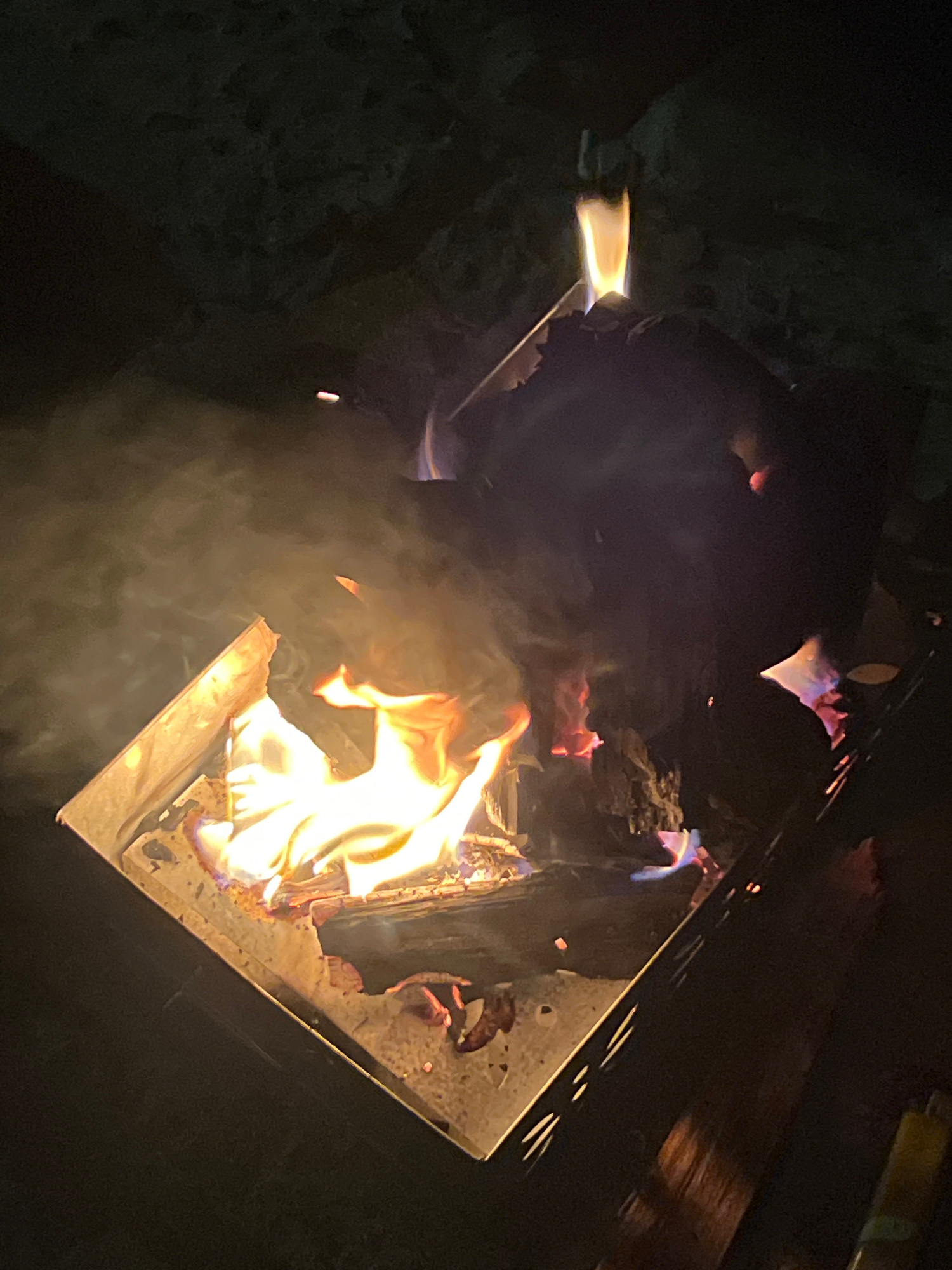 The image displays a vibrant fire burning within a metallic fire pit at night in Bắc Nha Trang, Vietnam. Bright, primarily yellow and orange flames erupt from the center of a square or rectangular met…read more