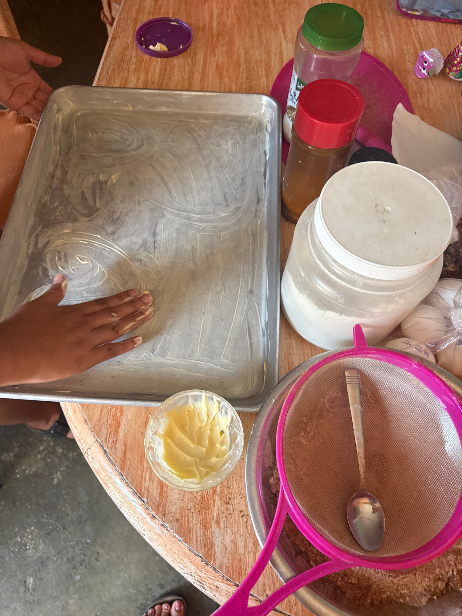 The image shows a kitchen scene with items arranged on a wooden table. A person's hand is spreading butter on a rectangular baking sheet. Nearby is a small container of more butter. Other objects pres…read more