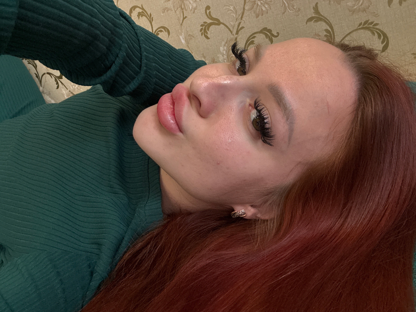 A young woman with red hair is reclining on a surface with a patterned fabric. She is wearing a green ribbed top. She has long, dark eyelashes and is wearing an earring. The location is not evident in…read more