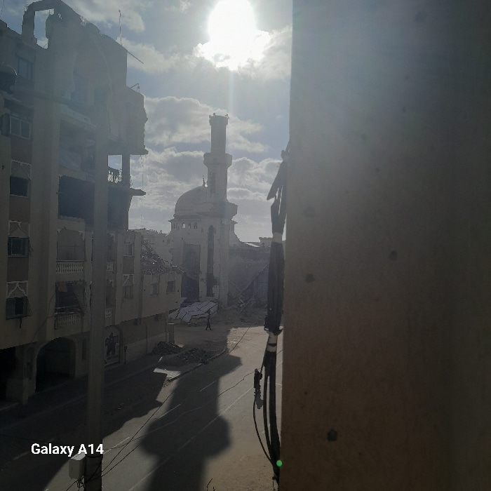 The image depicts a war-torn city landscape under a bright sun. Buildings are heavily damaged with gaping holes and rubble visible. A mosque with a prominent minaret and dome stands amidst the destruc…read more