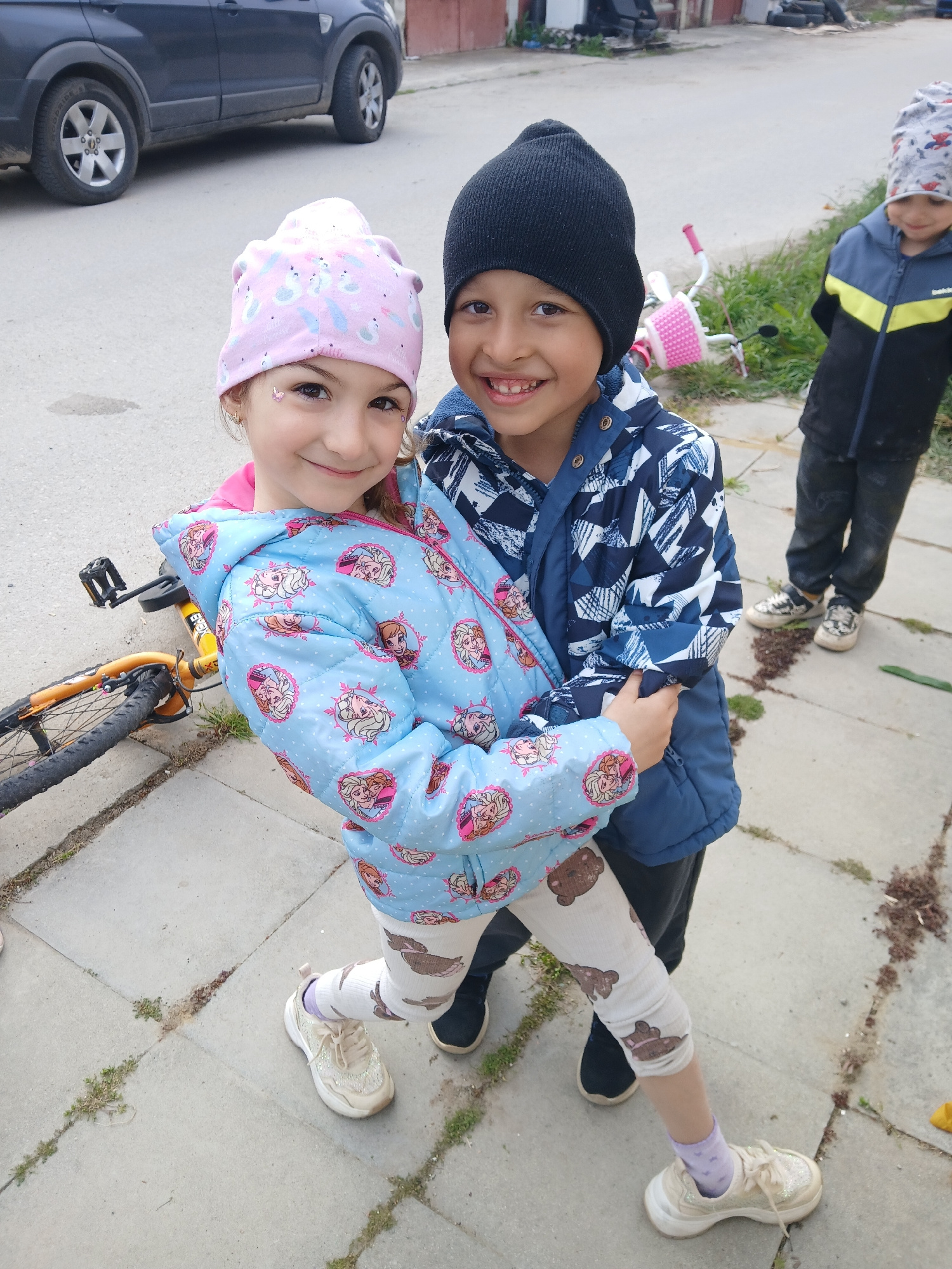 Two children are posing for a picture, likely taken outside. A girl with a pink hat and blue winter coat with "Frozen" characters is sitting on an orange bicycle. A boy wearing a black beanie and a bl…read more