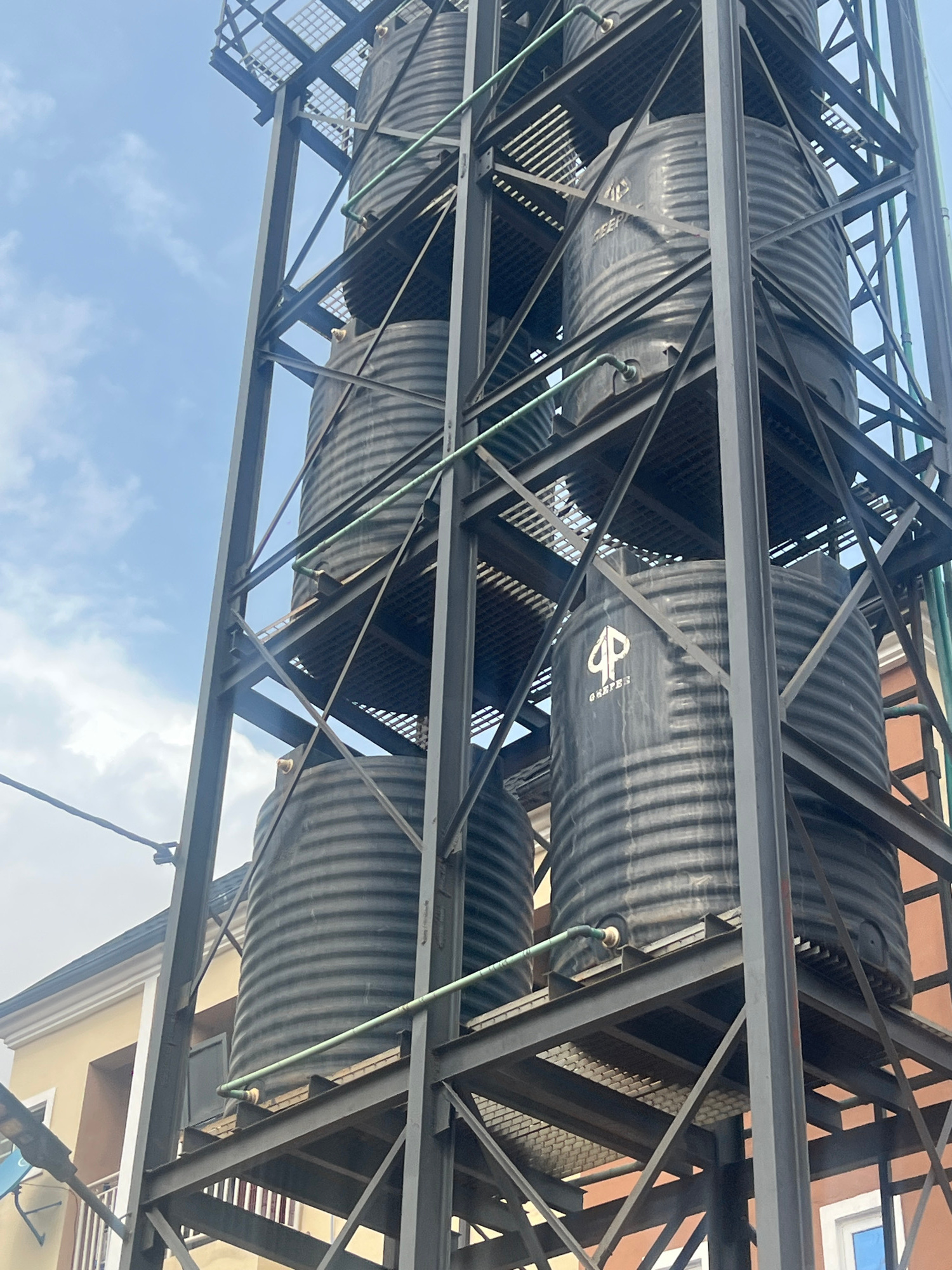The image shows multiple black water tanks stacked on a steel framework in Egan, Nigeria. The tanks are cylindrical with corrugated exteriors and markings, including a visible "GP" logo on one. The st…read more