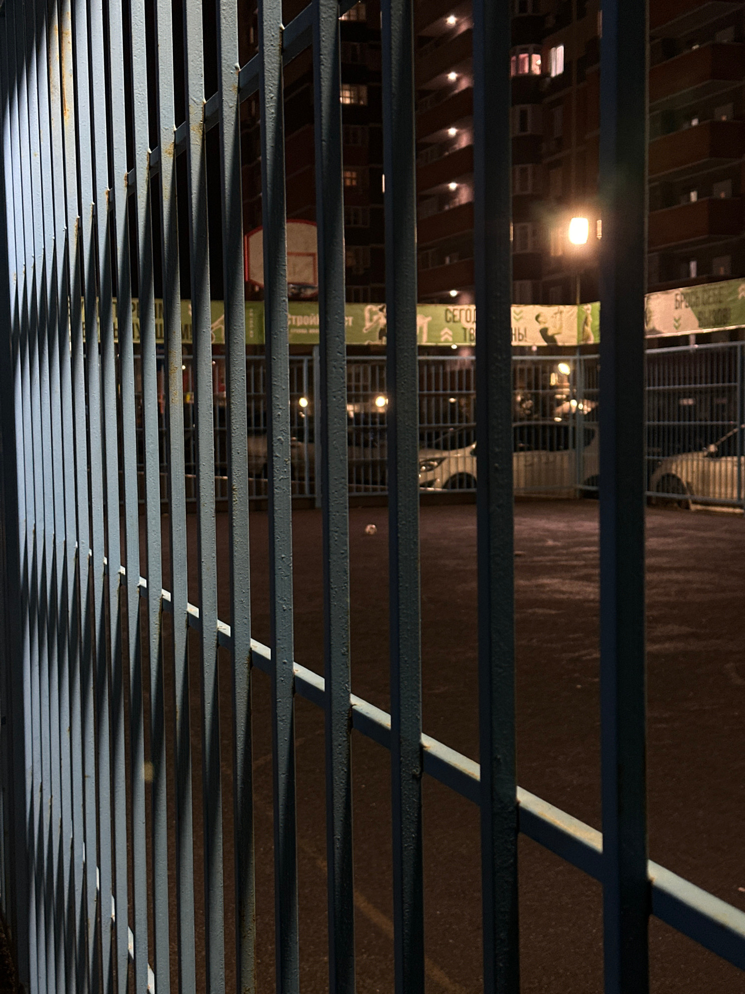 The image shows a metal fence in the city of Kuleshovka, Russia. The fence is gray-blue and runs horizontally across the frame. Behind the fence, a dark building with lit windows is visible. There is…read more