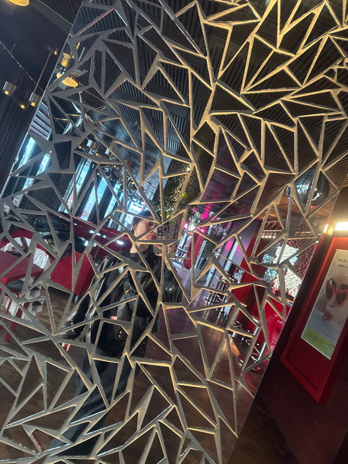 A fragmented reflection of an individual taking a self-portrait with a smartphone is captured in a decorative mirror within an indoor commercial establishment in Tbilisi, Georgia. The mirror's surface…read more