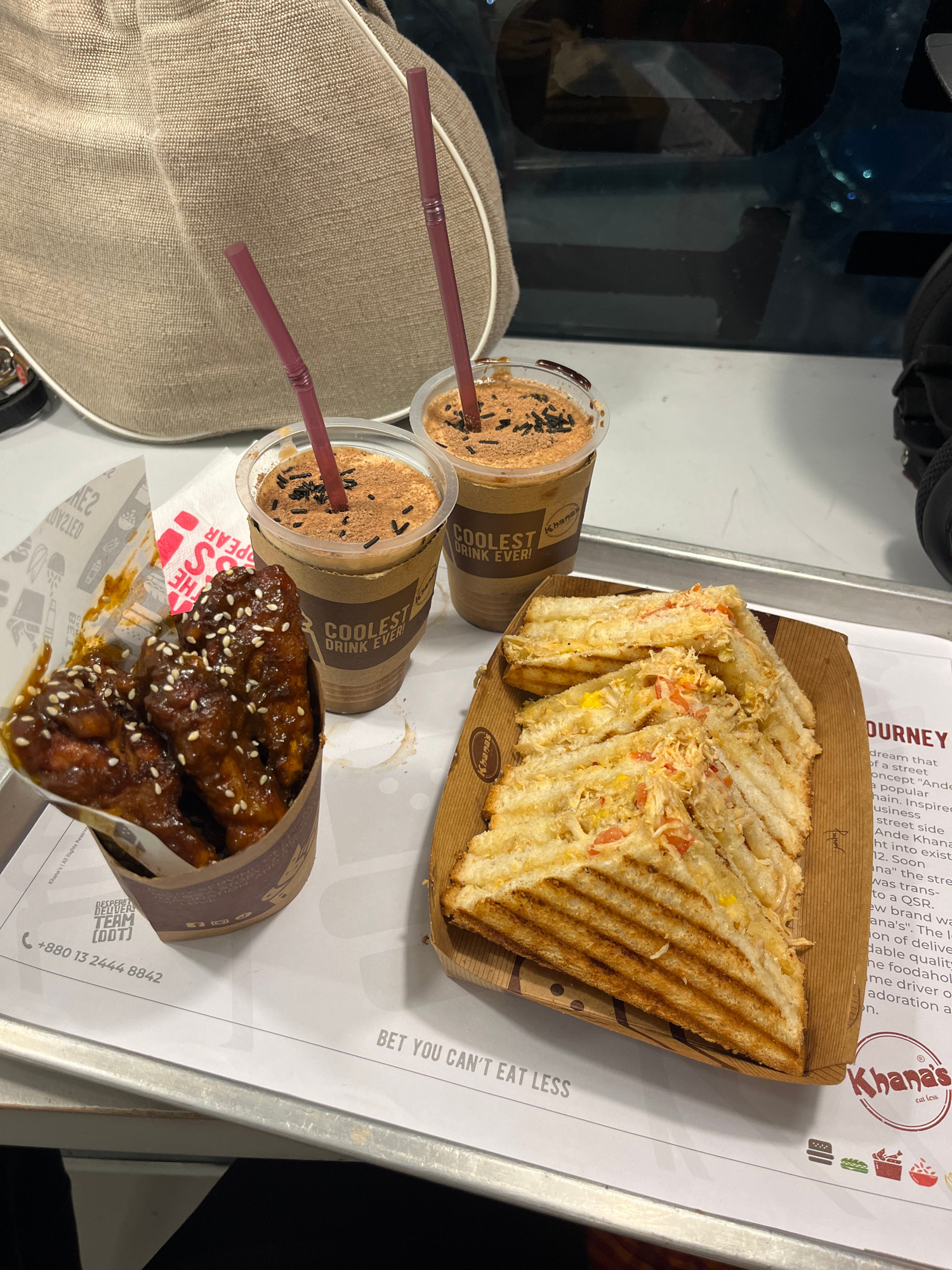 The image displays a casual meal, likely a takeout or delivery order, presented on a metallic tray partially covered by a white paper placemat. The scene features three food items and two beverages.…read more