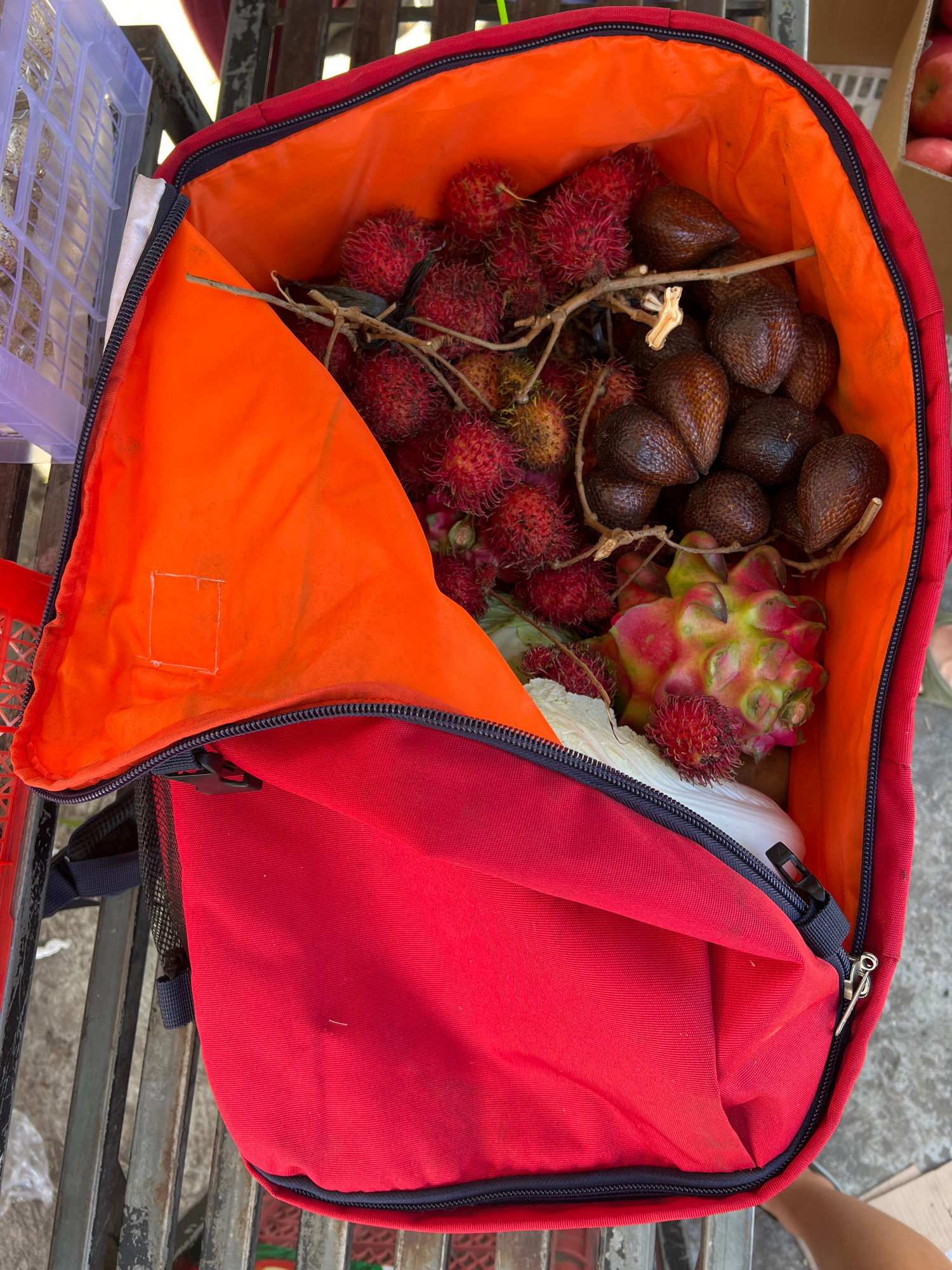 The image shows a red and orange backpack, open and filled with a variety of fresh fruits. These include rambutans, salak, and a dragon fruit. A leafy green vegetable also sits among the fruits. The b…read more