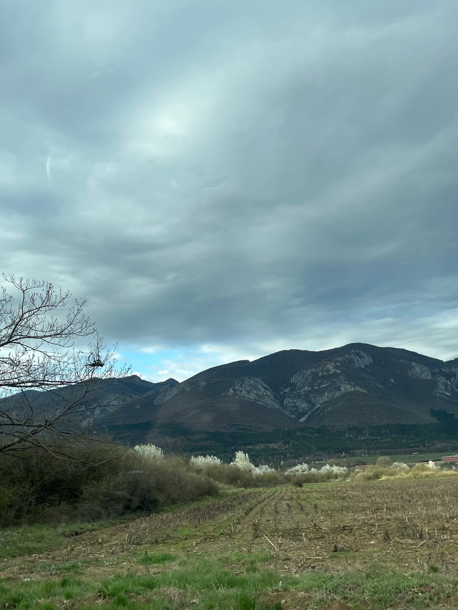 The image depicts a landscape scene with a cloudy sky dominating the upper portion. A mountain range with visible rock formations runs vertically in the middle ground. In the foreground, bare trees wi…read more