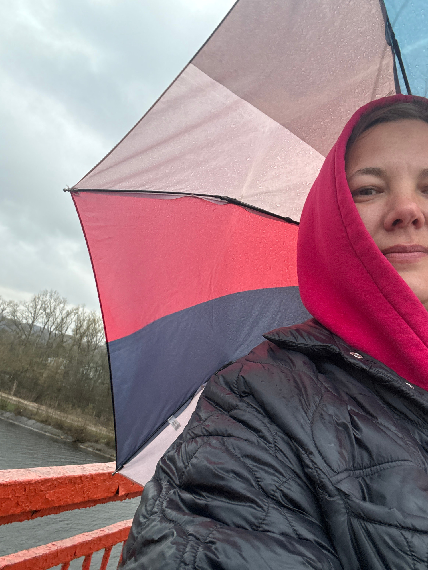 The image is presented rotated, capturing a person partially visible under a colorful umbrella on a rainy, overcast day in Dmitrov, Russia. In the upper right (when upright), the face of a person is…read more