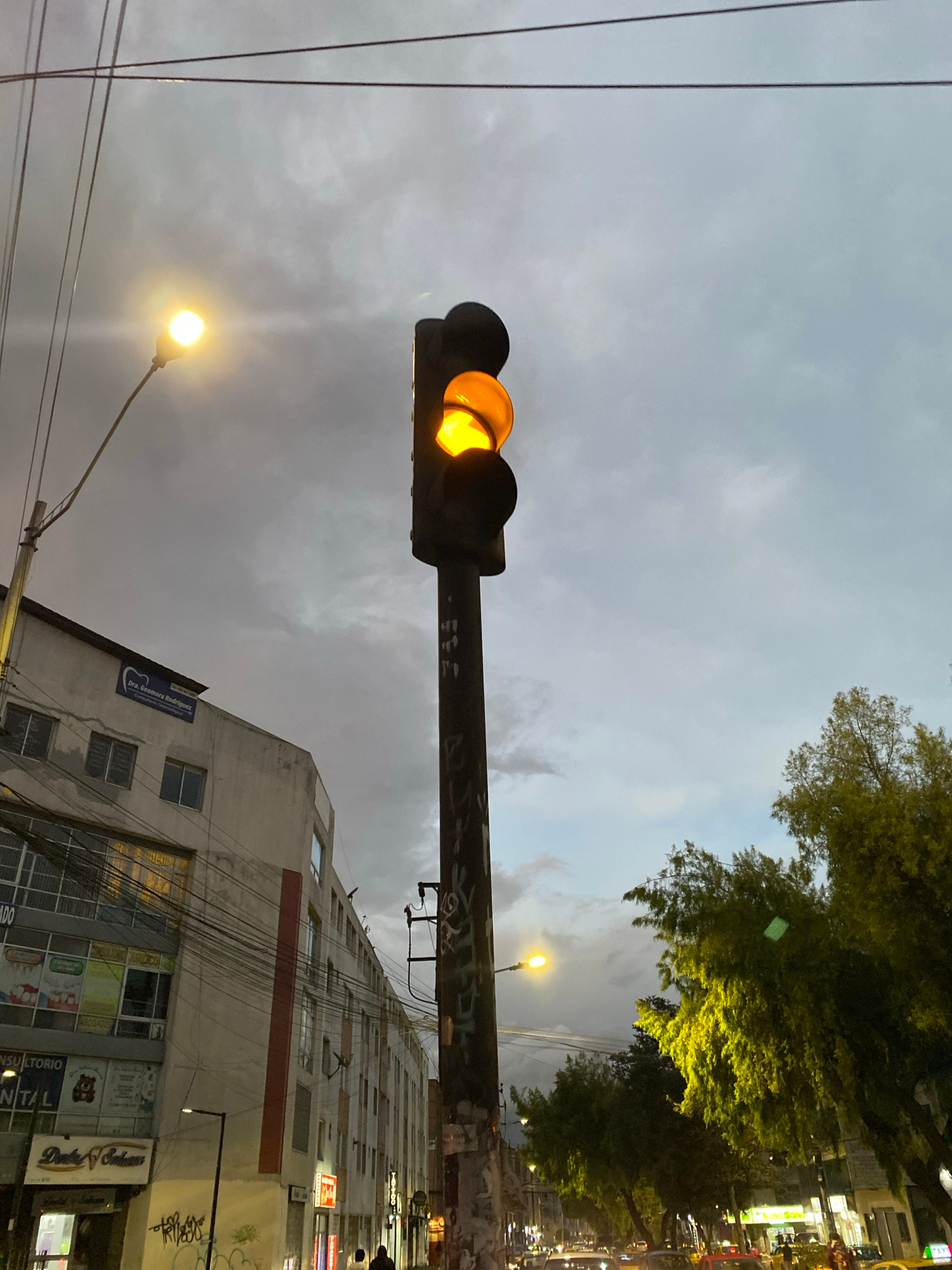 The image shows a low-angle view of a street scene in Quito, Ecuador. A traffic light displaying a yellow light is in the foreground. The traffic light's pole is covered in graffiti. A cloudy sky fill…read more