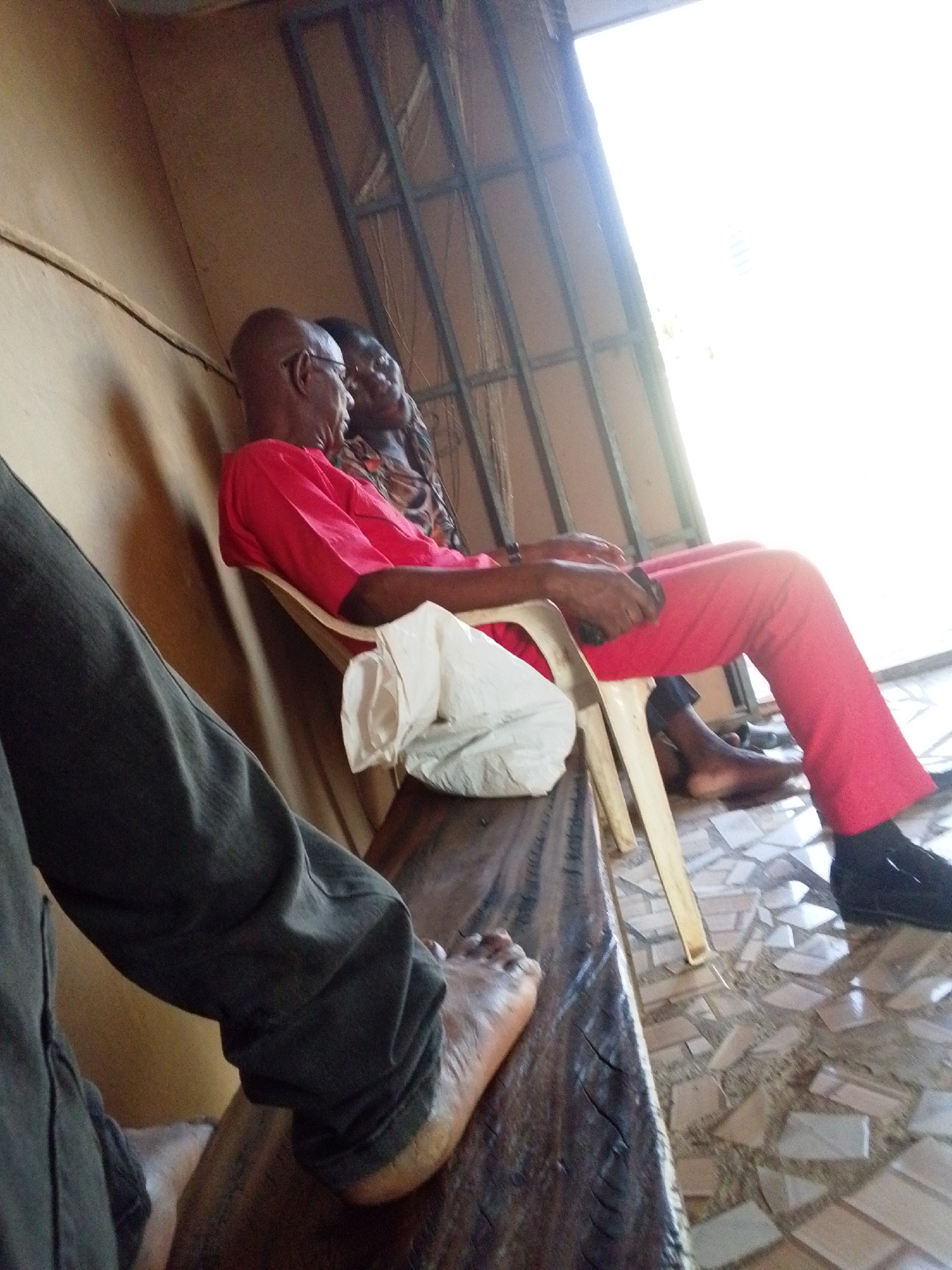 The image shows two older individuals seated in an indoor space. A bald man wearing glasses and a red shirt sits on a white plastic chair, with a white plastic bag hanging from the chair. A woman is s…read more