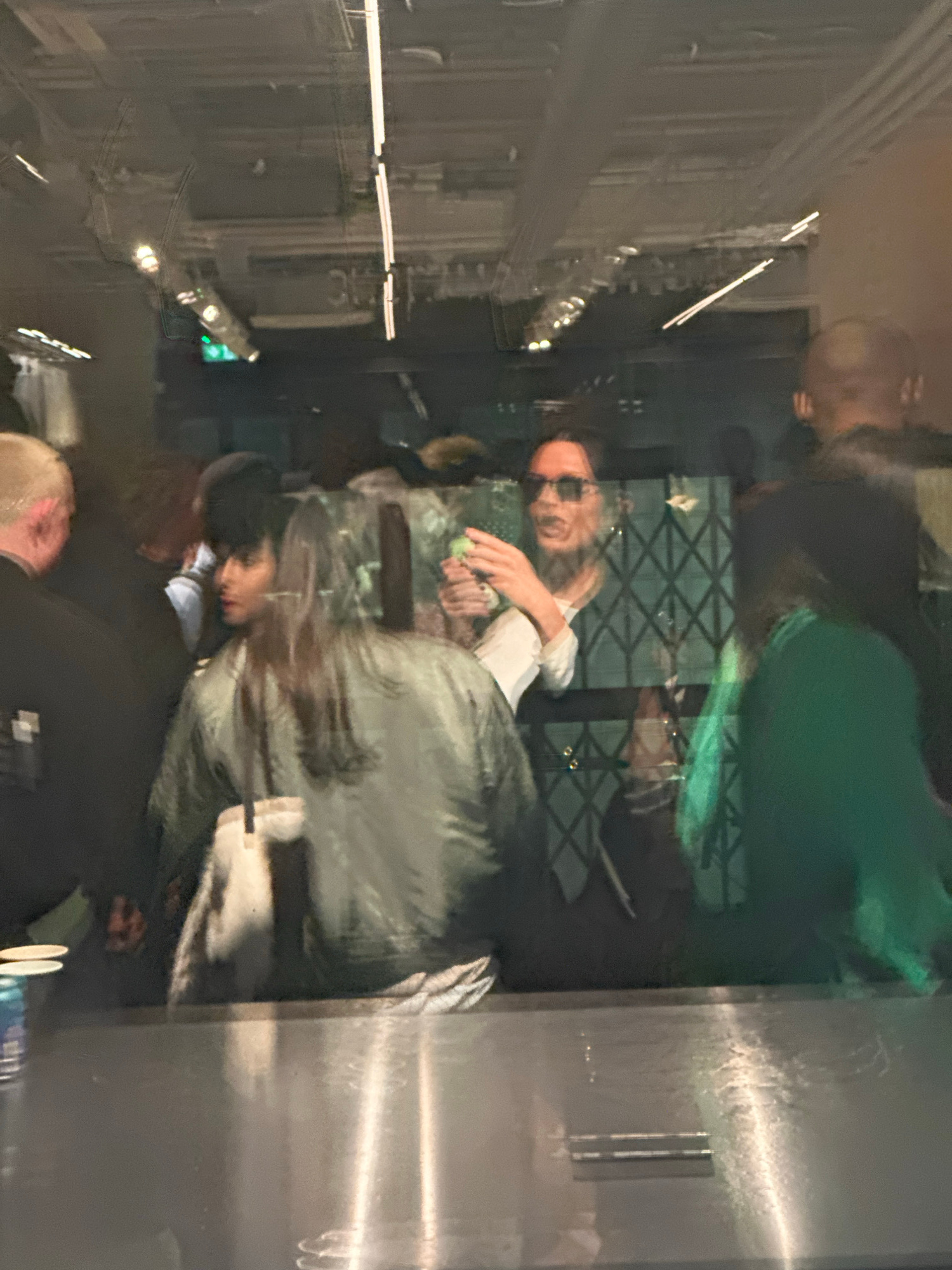 This medium-angle indoor shot captures a dynamic scene primarily through a reflective surface, likely a window or glass panel, creating a layered and somewhat abstract view. The image is oriented with…read more