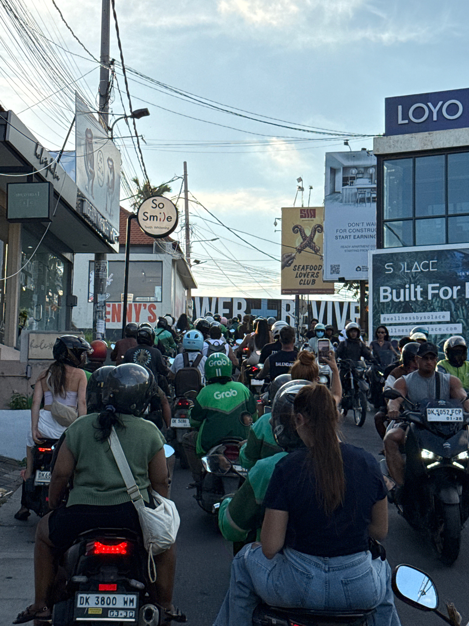 The image shows a congested street in North Kuta, Indonesia, filled with scooters and motorcycles. Many riders wear helmets, and some carry green "Grab" delivery bags. Street signs and advertisements…read more