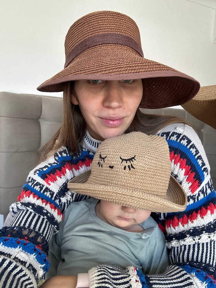 An adult female is depicted holding an infant in an indoor setting in Fethiye, Turkey. The adult female, positioned centrally, has fair skin, visible green eyes, light freckles across her nose and ch…read more