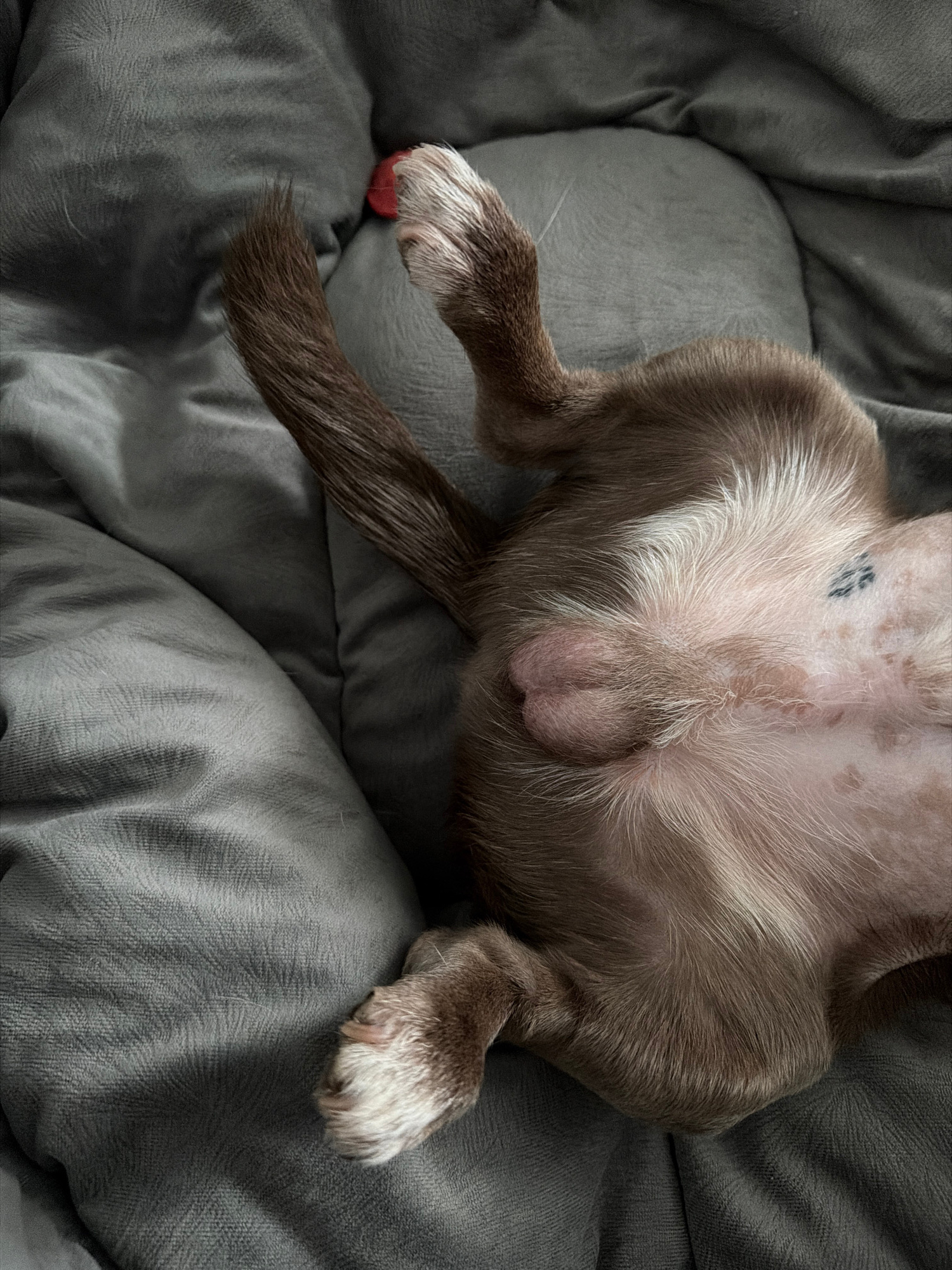 An unidentifiable male dog lays belly-up on a grey dog bed. The dog has brown fur on its legs and tail, and white fur on its paws. The dog's belly and chest are a lighter, creamy color. There is a sma…read more