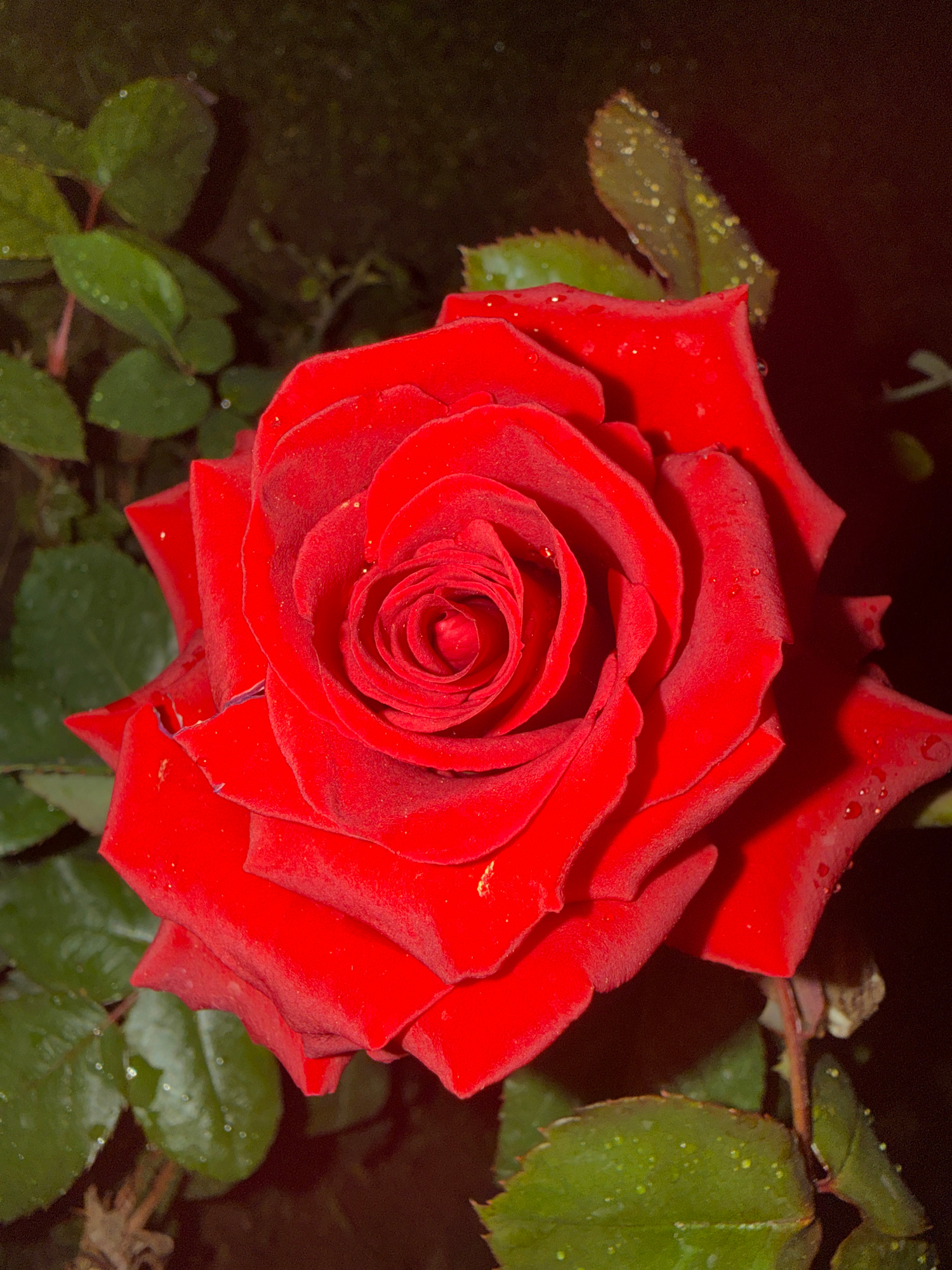 A close-up shot captures a fully bloomed red rose with numerous petals arranged in a spiral pattern. The rose appears to be dusted with moisture, possibly water droplets. Surrounding the rose are gree…read more