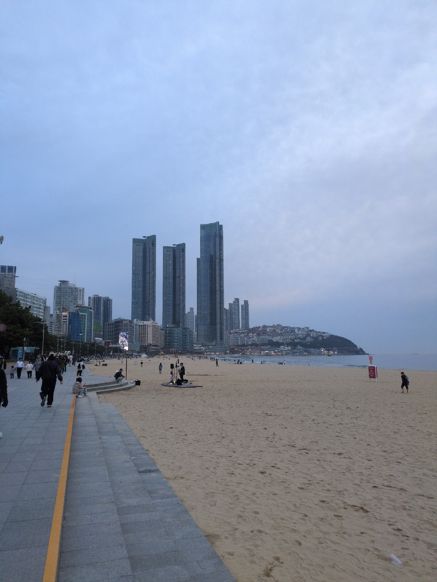 The image depicts a beach scene in Busan, South Korea, characterized by a wide sandy beach, modern skyscrapers, and a coastal hill. In the foreground, a gray tiled promenade runs along the bottom edg…read more