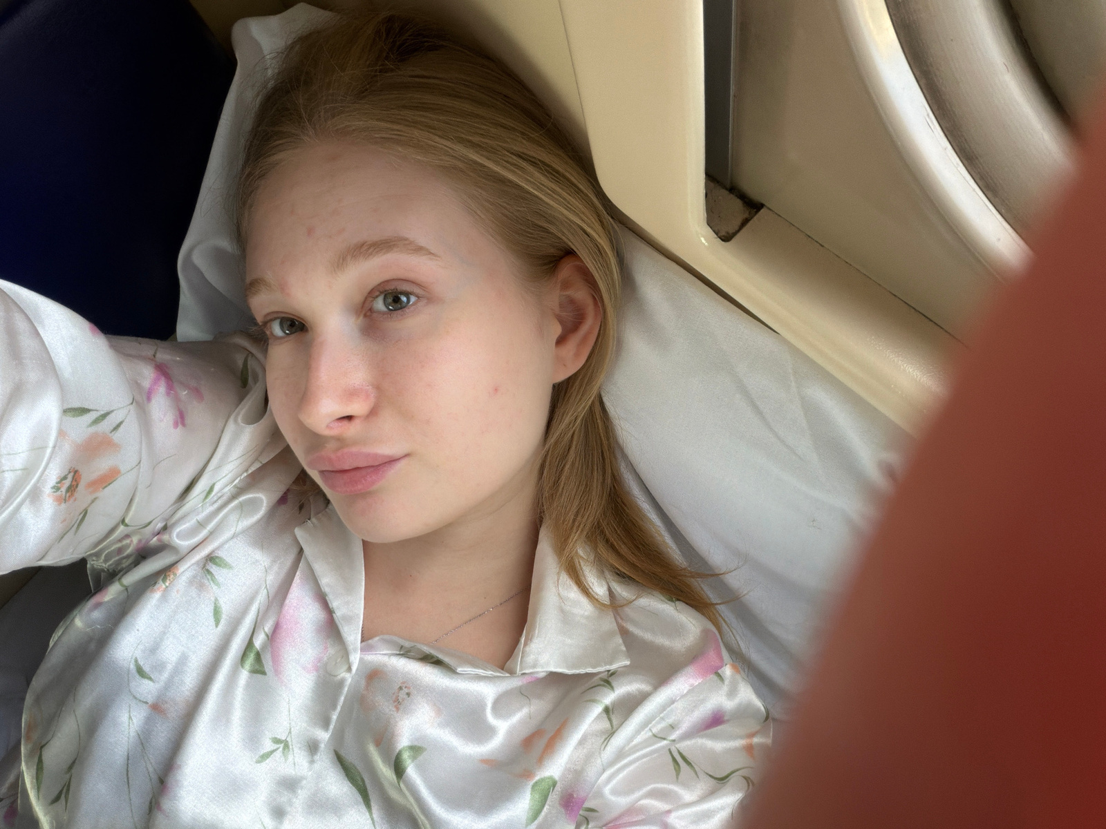 A woman is lying on a bed in what appears to be a hospital room. She is wearing a white satin robe with a floral pattern. She has blonde hair, fair skin, and blue eyes. The bed has white sheets and a…read more