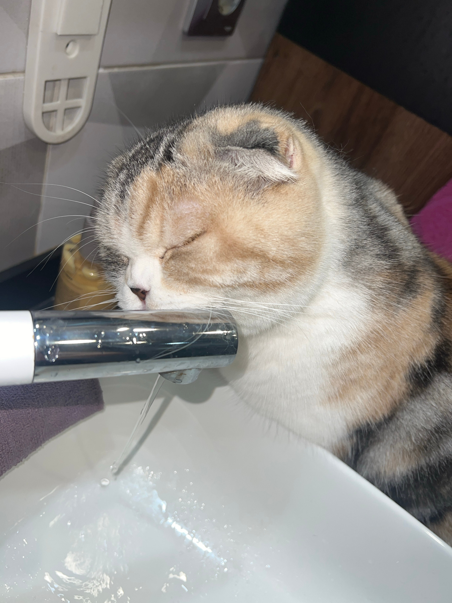 A close-up, high-angle indoor shot shows a Scottish Fold cat drinking from a running tap in a white sink. The cat, with multi-colored fur (white, gray, and tan), has its face close to the tap. Water i…read more