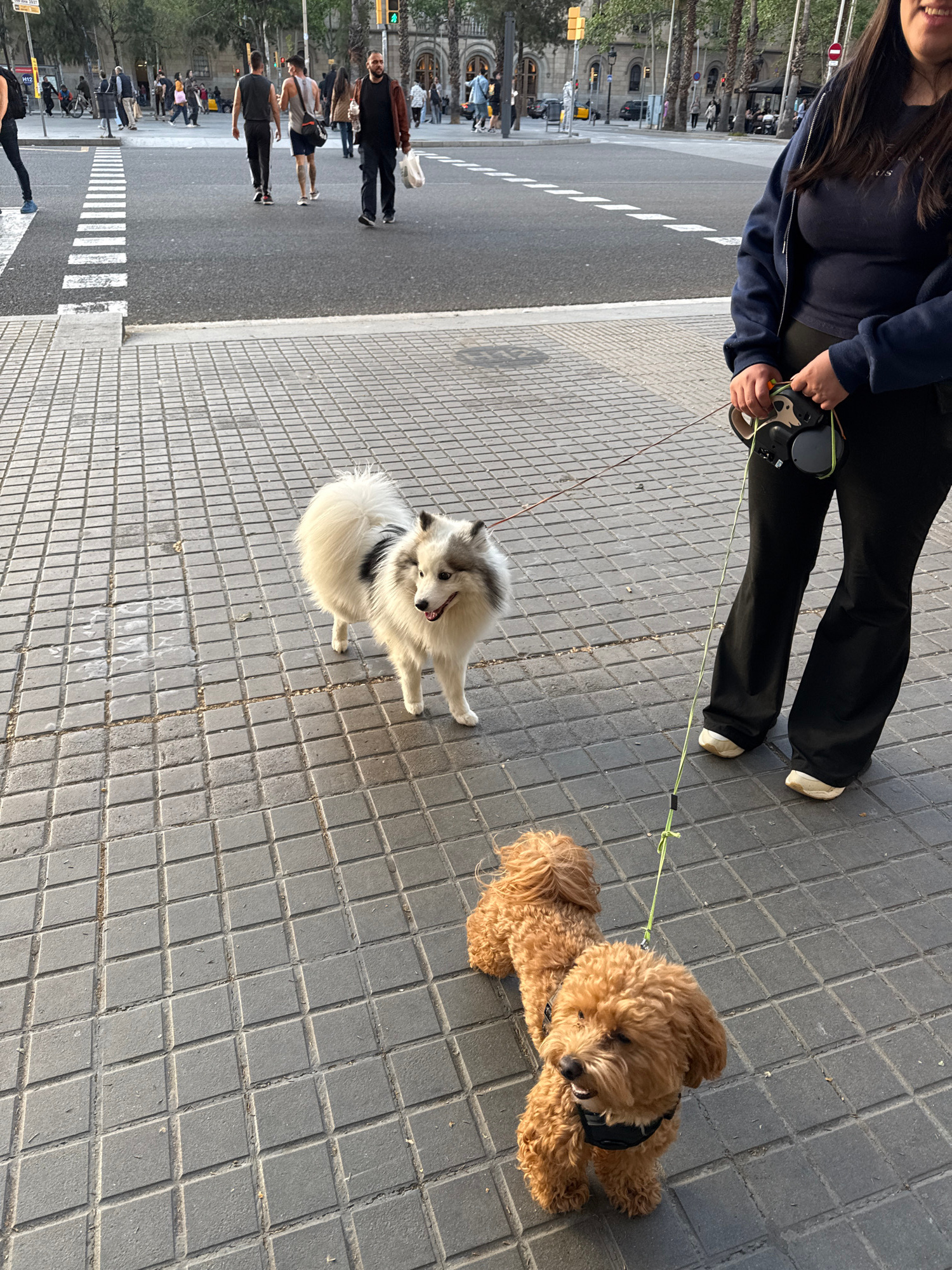 A high-angle shot shows a woman walking two dogs on a leash on a Barcelona, Spain, sidewalk. The woman, seen from the shoulders down, wears a dark blue jacket, black pants, and white sneakers. She is…read more