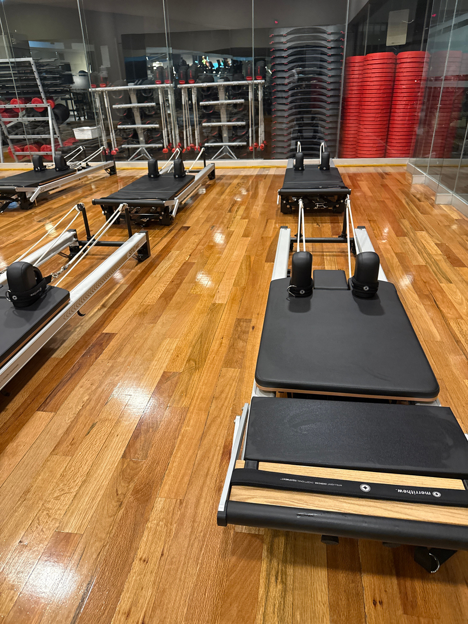 The image shows the interior of a fitness studio. Two Pilates reformer machines are positioned on a hardwood floor with a light brown finish. One machine is closer to the camera and angled diagonally,…read more
