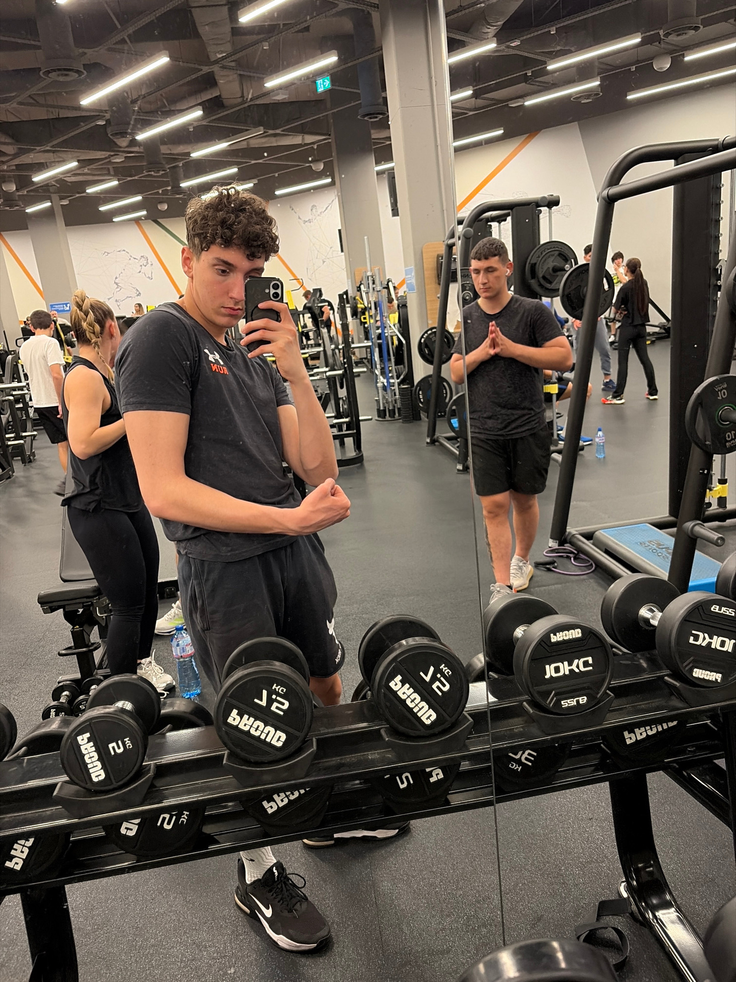 A photo shows a man taking a selfie in a gym with a mirror. The man is looking at the camera and flexing his bicep. The mirror is showing a reflection of the gym, including a second, fainter image of…read more