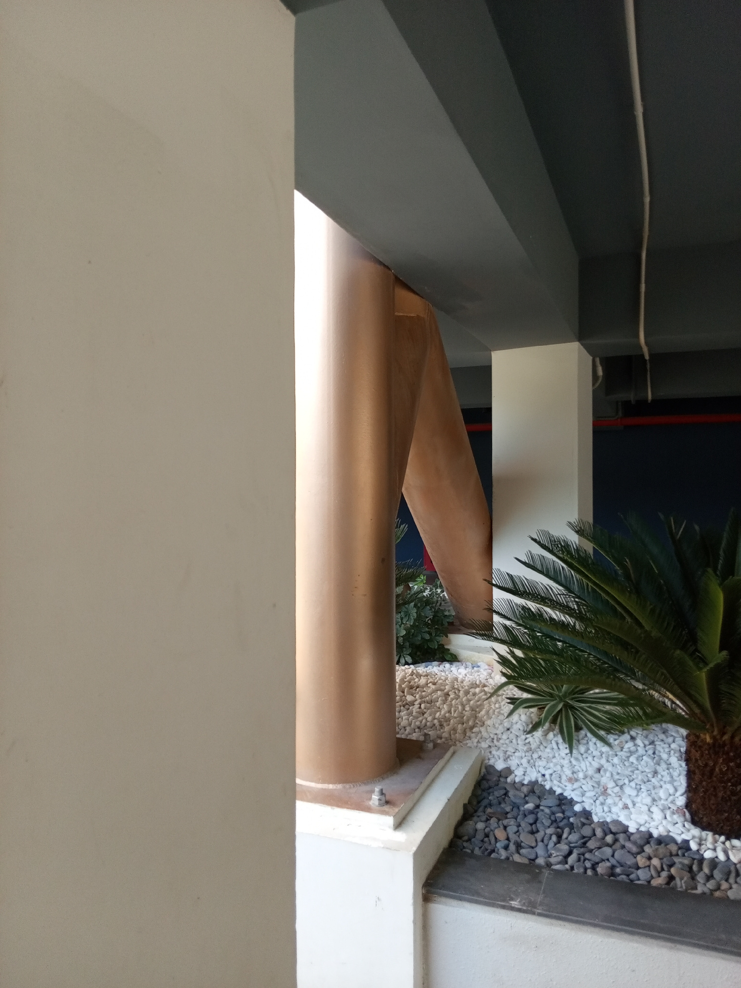The image presents an architectural scene, seemingly an outdoor space or atrium, possibly in the Bac Natural Heritage Area Trang, Vietnam. A large, light-colored column dominates the left foreground,…read more
