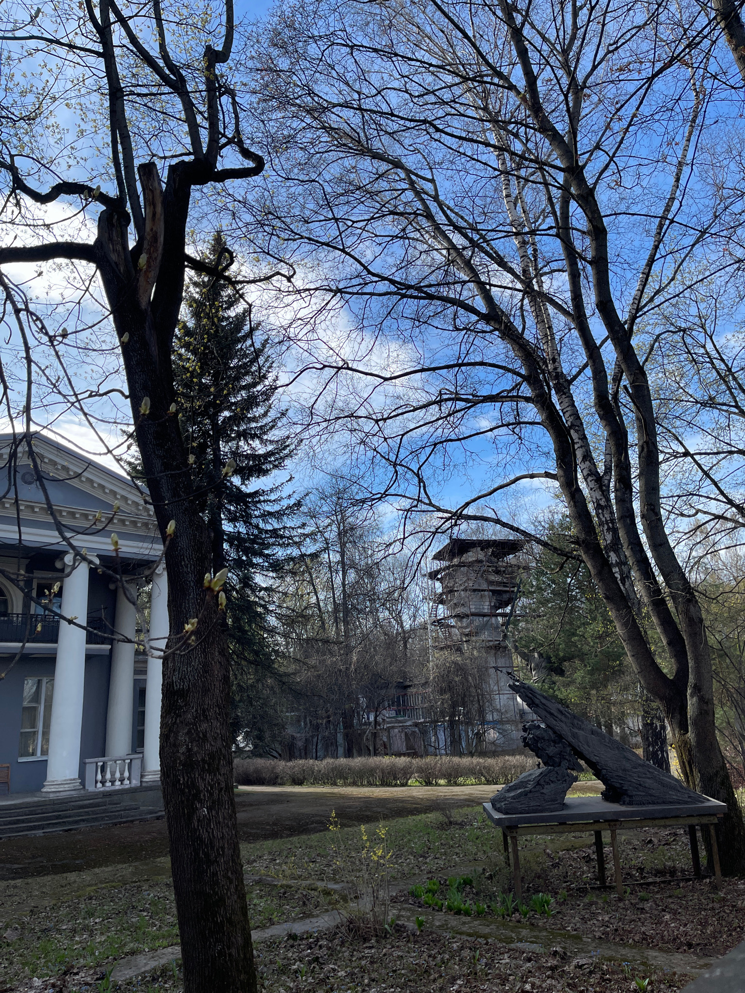 The image presents a daytime outdoor scene in Khimki, Russia, featuring a sky-high perspective through tree branches. The sky is bright blue with scattered white clouds. The upper and central parts of…read more