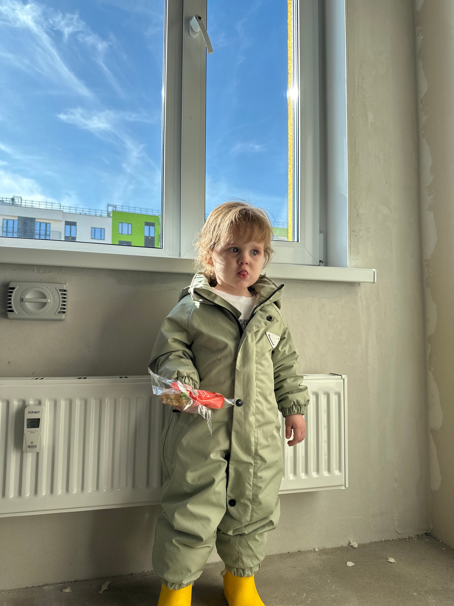 A young child stands in an unfurnished room within a building under construction or renovation in Pervomaysky, Russia. The child, with light hair, wears a light olive-green full-body jumpsuit and brig…read more