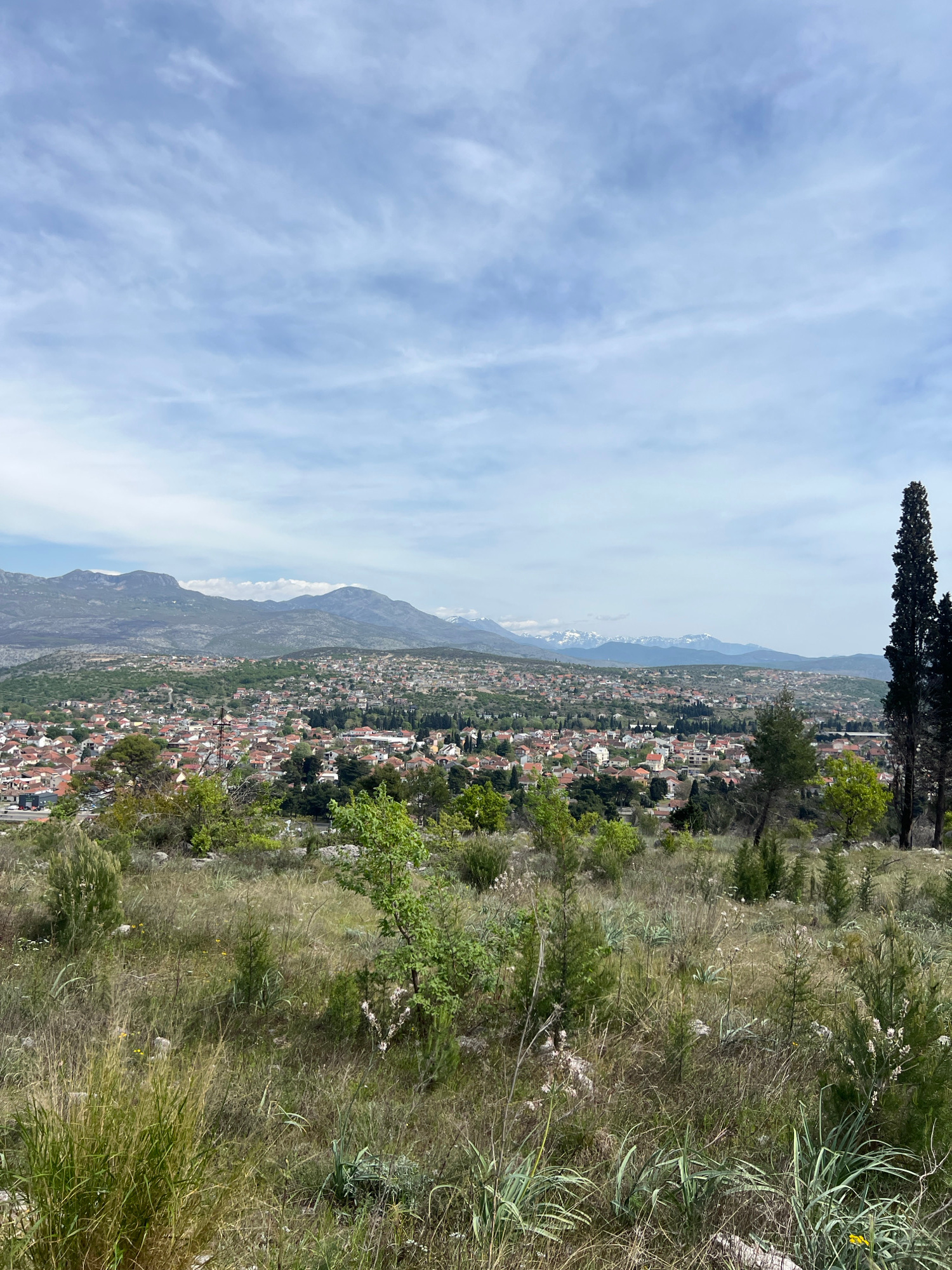 The image shows an elevated view of a town in Podgorica, Montenegro, nestled at the base of a mountain range. The foreground is dominated by a hillside covered in dry grasses and low-lying vegetation.…read more