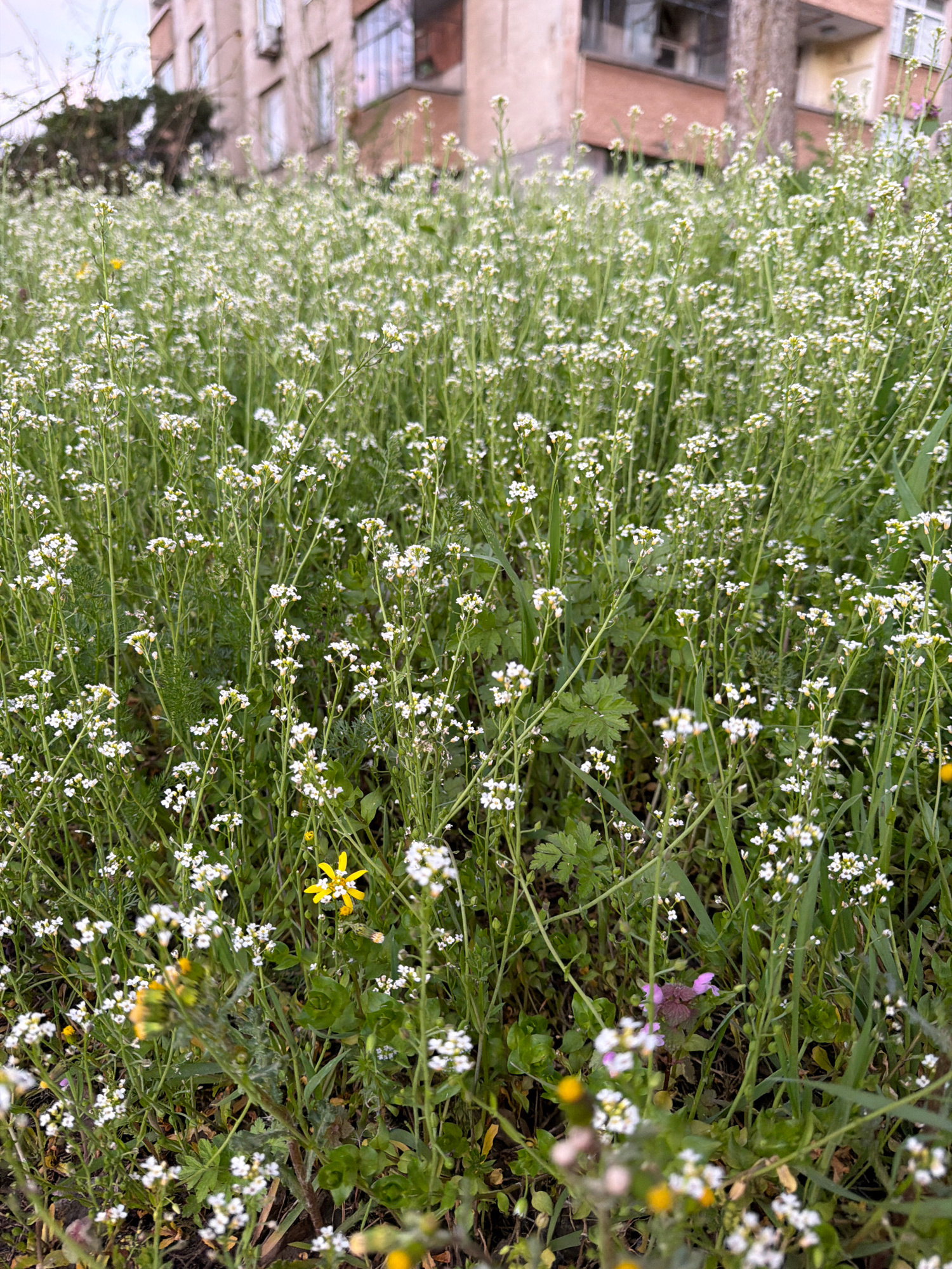 A ground-level view of a dense patch of small white flowers with thin green stems, possibly weeds, growing in an urban environment. A building facade is visible in the background, suggesting a locatio…read more