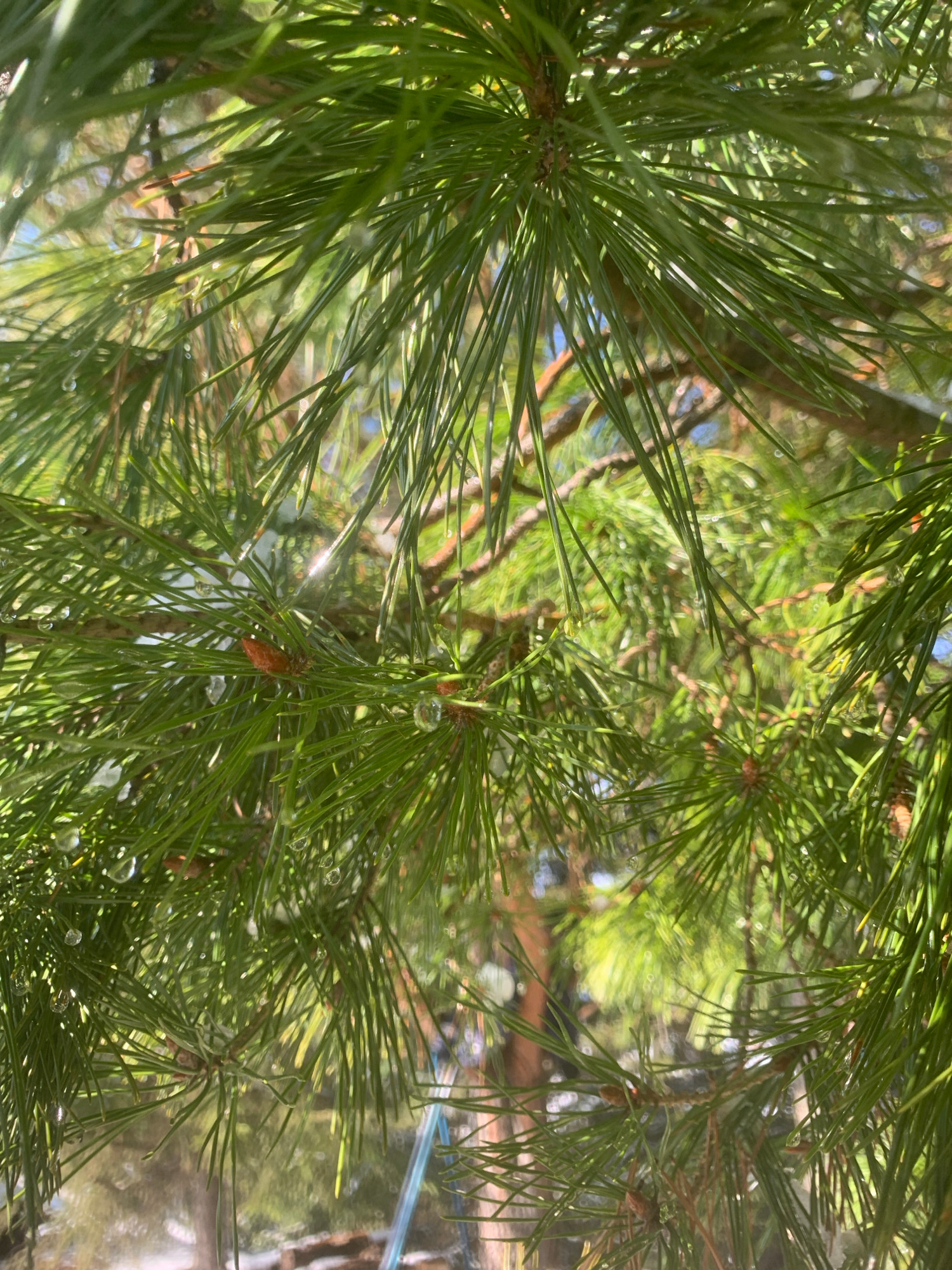 Close-up of green pine needles with water droplets in Кадряково, Russia. Visible are needle bundles, branch segments, and small pine cones. Sunlight illuminates the scene. A blurred background suggest…read more