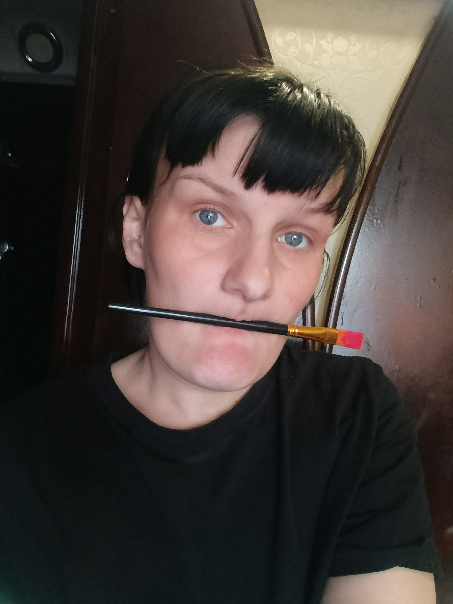 A close-up, chest-up portrait features a person with short, dark hair and bangs, and striking blue eyes, looking directly at the viewer. She holds a black-handled paintbrush horizontally in her mouth;…read more
