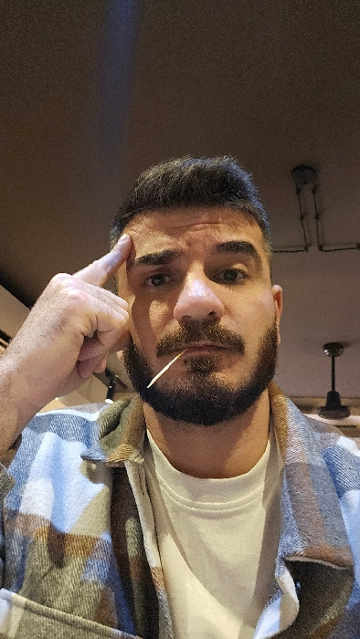 A selfie captures a man with dark hair and a beard, holding a toothpick in his mouth and pointing at his temple. He wears a white t-shirt under a plaid flannel shirt. The background is dark, with indi…read more
