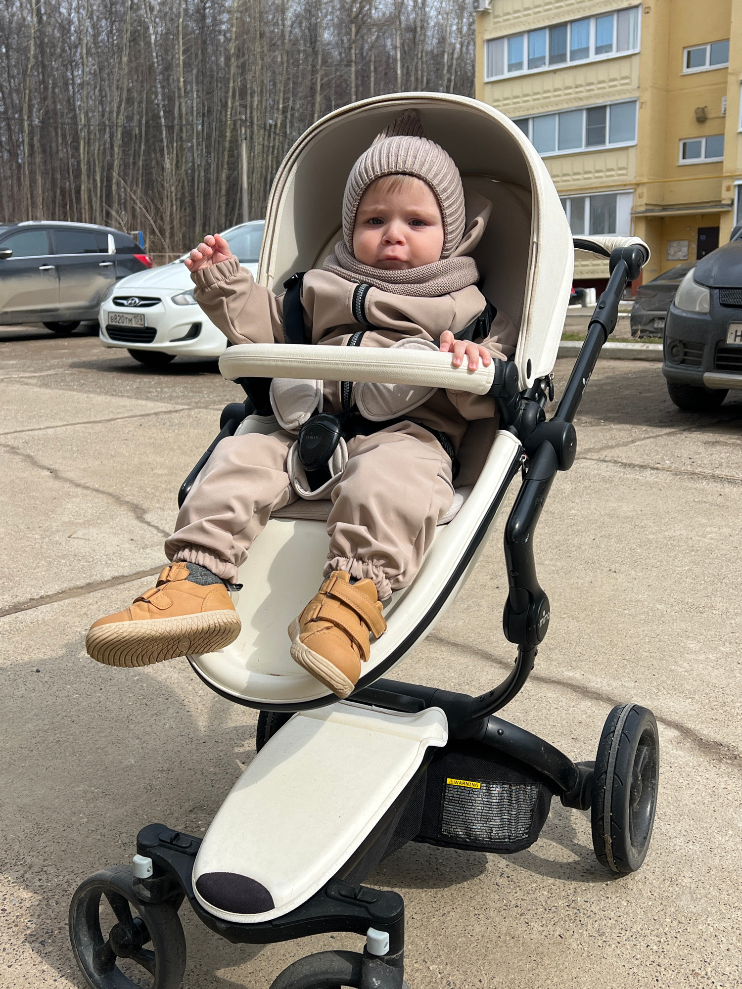 A young child sits in a modern white stroller on a paved surface, seemingly outdoors. The child is wearing a beige outfit, including a knit hat, jacket, pants, and brown shoes. The stroller has a blac…read more