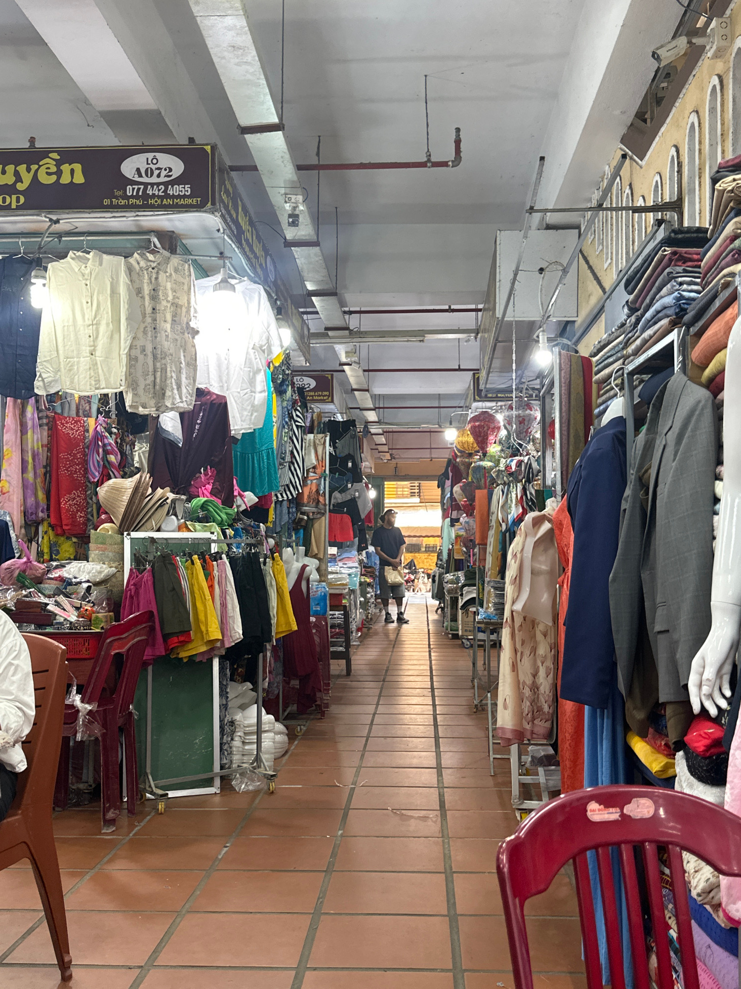 The image captures a commercial space, specifically a clothing market stall within the Hoi An Market in Hoi An Ward, Vietnam. A narrow passageway stretches into the distance, flanked by stalls overflo…read more