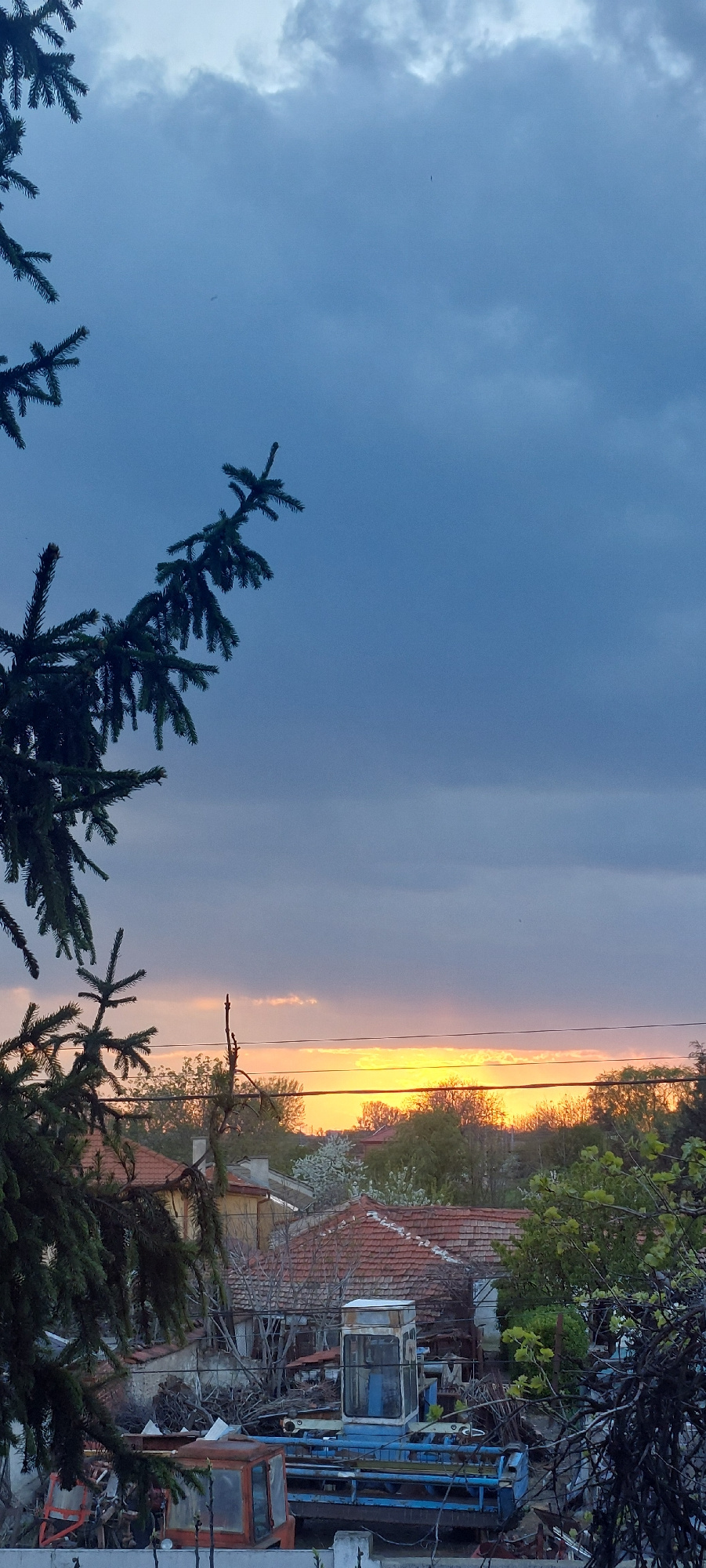 The image captures a sunset scene in Yagodovo, Bulgaria. A clear distinction is visible between the blue, cloudy sky and the horizon, where the sun sets in a bright orange glow. In the foreground, eve…read more