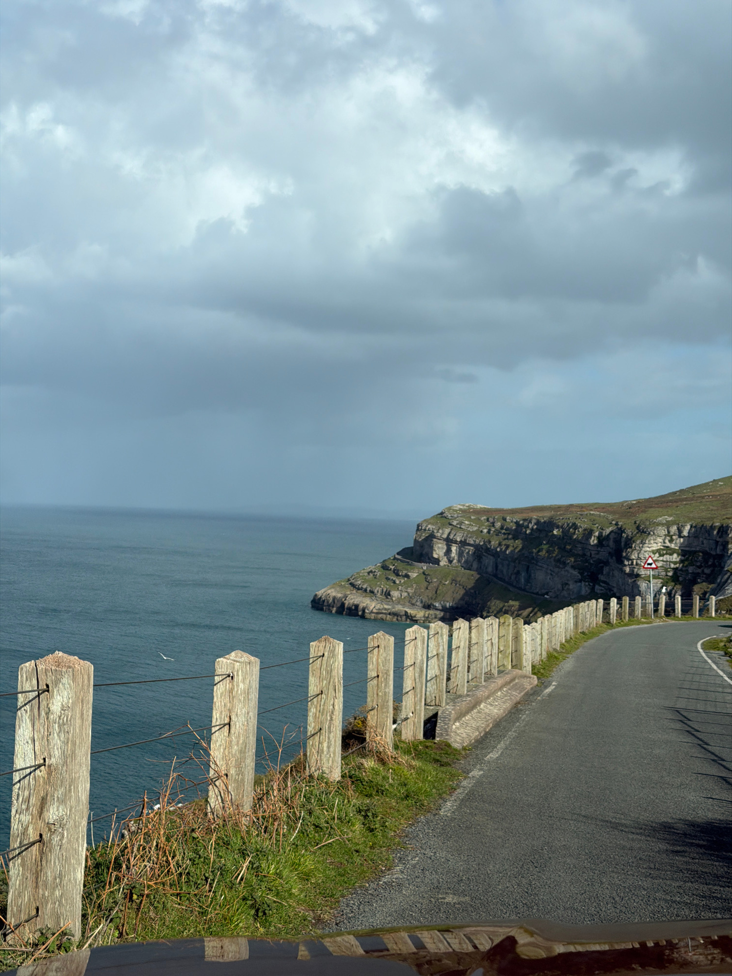 The image captures a coastal scene in Llandudno, United Kingdom. A paved road runs along the edge of a cliff. Adjacent to the road is a low, wooden fence constructed with horizontal planks supported b…read more