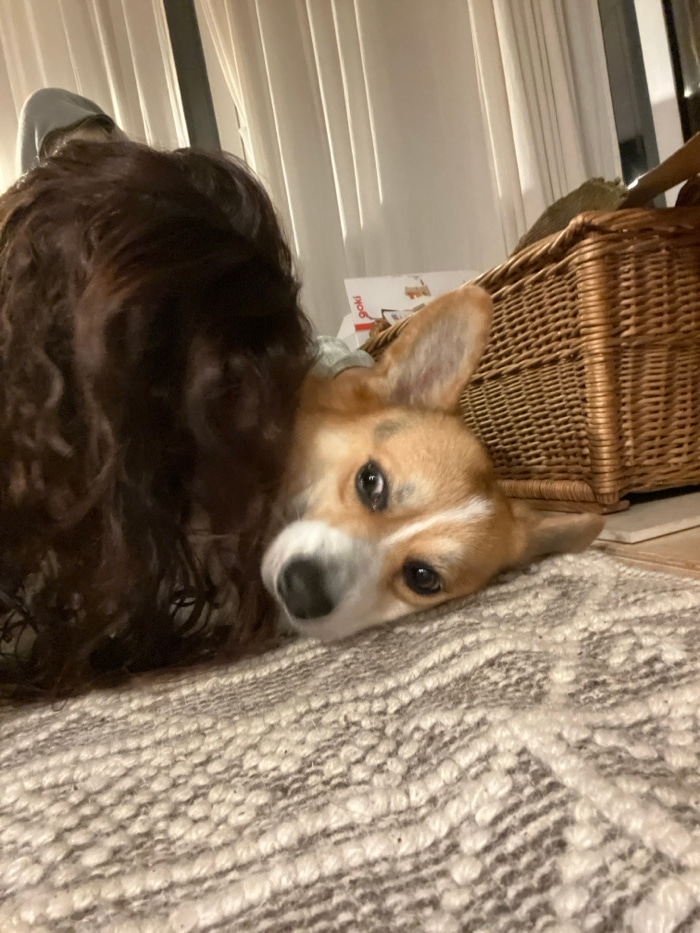 A Corgi dog's head and shoulders are visible next to a tan woven basket and a textured tan rug. The dog's face has tan and white fur, with bright eyes looking directly at the camera. Dark brown wavy h…read more