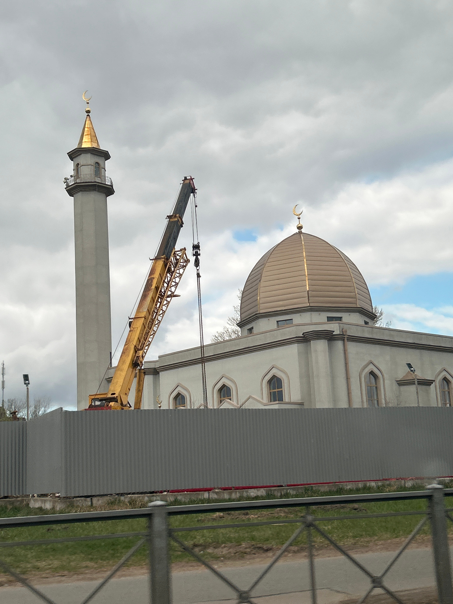 A horizontal, medium shot reveals a mosque in Saint Petersburg, Russia, against a backdrop of partly cloudy skies. The mosque includes a beige dome and a tall, gray minaret, both topped with golden cr…read more