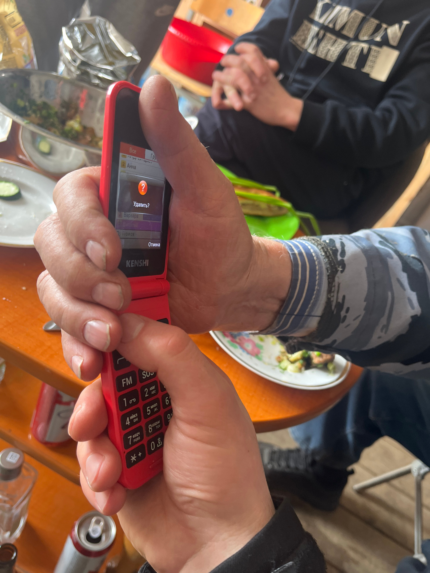 An indoor scene captures a close-up view of a person holding a red KENSHI flip phone, appearing to interact with its menu. The phone's screen displays text in Russian, including "Удалить?" (Delete?),…read more